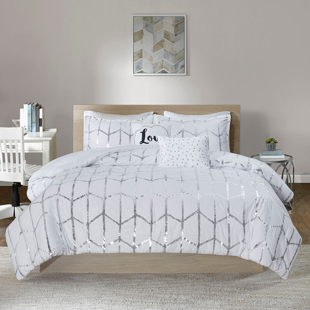 Refresh your bedroom with the modern shimmer of the Raina Metallic Printed Comforter Set. Beautifully balanced between contemporary geometry and soft, ultra-plush texture, this set delivers eye-catching metallic detail on a crisp white ground and finishes the look with coordinated shams and embroidered accent pillows for a polished, hotel-inspired aesthetic.