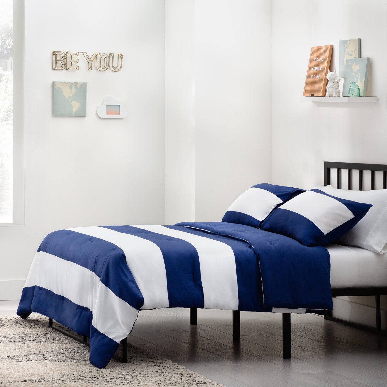Add a refined, cozy touch to your bedroom with this soft, reversible microfiber comforter featuring a classic rugby stripe pattern. Designed for easy styling and everyday comfort, it pairs a plush down-alternative fill with durable microfiber for a lightweight yet warm sleep experience. The neutral grey stripe offers versatile styling for modern or traditional décor, while the reversible construction gives two looks in one.