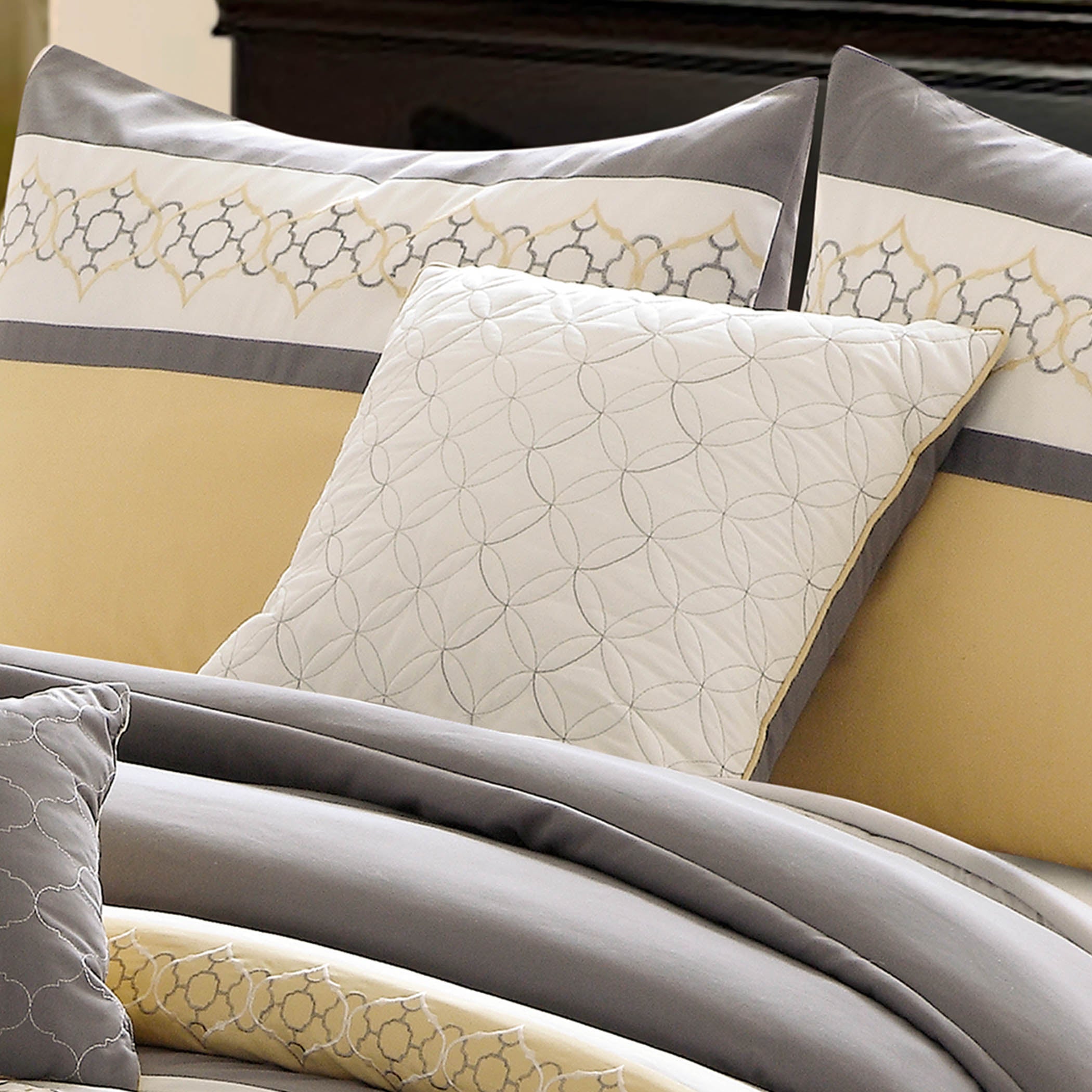 Brighten your bedroom with the Riverbrook Home Verdugo 7-piece king comforter set, featuring contemporary geometric embroidery and a warm palette of yellow and grey for a stylish, layered look. Made from durable polyester with soft fill, this set offers both visual appeal and everyday comfort—ideal for modern and transitional decor.