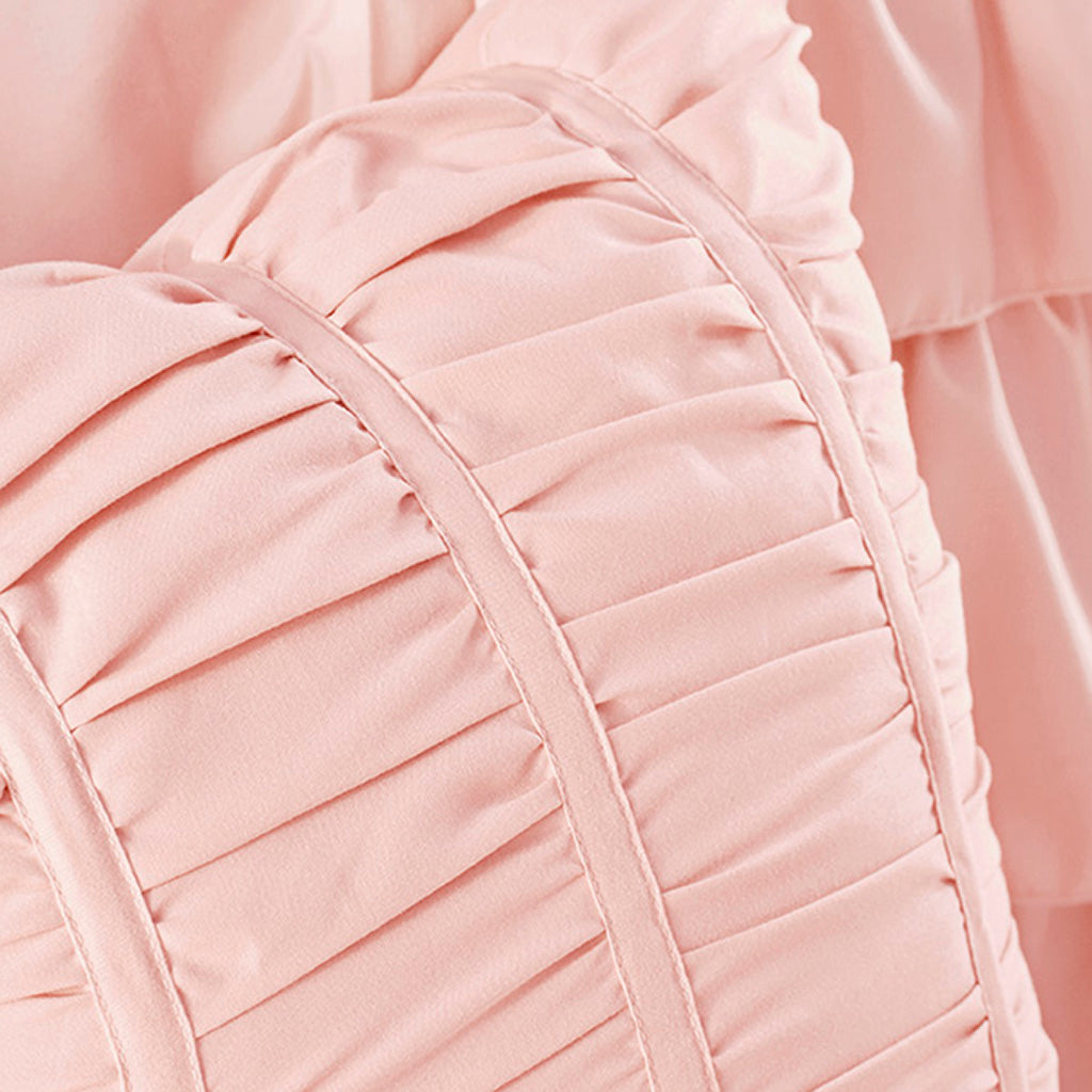 - Design: Flowing waterfall ruffles across the bottom half of the comforter create a soft, romantic silhouette; solid blush reverse offers a clean, versatile look