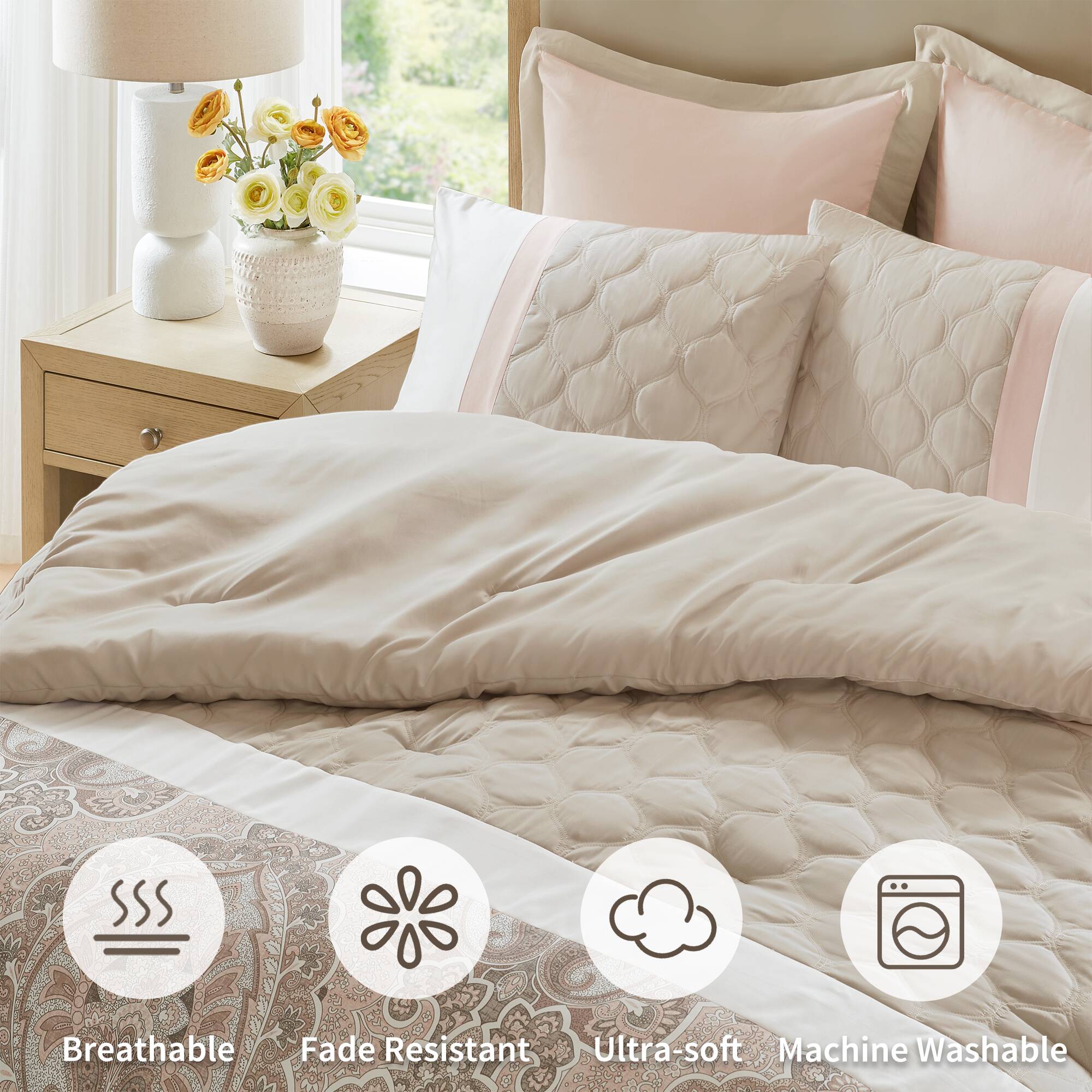 Bring a touch of refined elegance to your bedroom with the Shawnee 8-piece comforter set from 510 Design. Combining soft textures, classic quilting, and subtle damask accents in blush and taupe, this coordinated ensemble creates a polished, inviting bedscape that’s both comfortable and easy to care for.