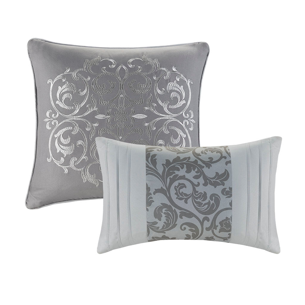 Refresh your bedroom with the Ramsey embroidered 8-piece comforter set — a refined, transitional ensemble that blends textured details and soft grey tones for an inviting, finished look. Crafted from ultra-soft microfiber with embroidered, pieced panels, quilting, and pintuck accents, this set balances decorative appeal with everyday practicality.