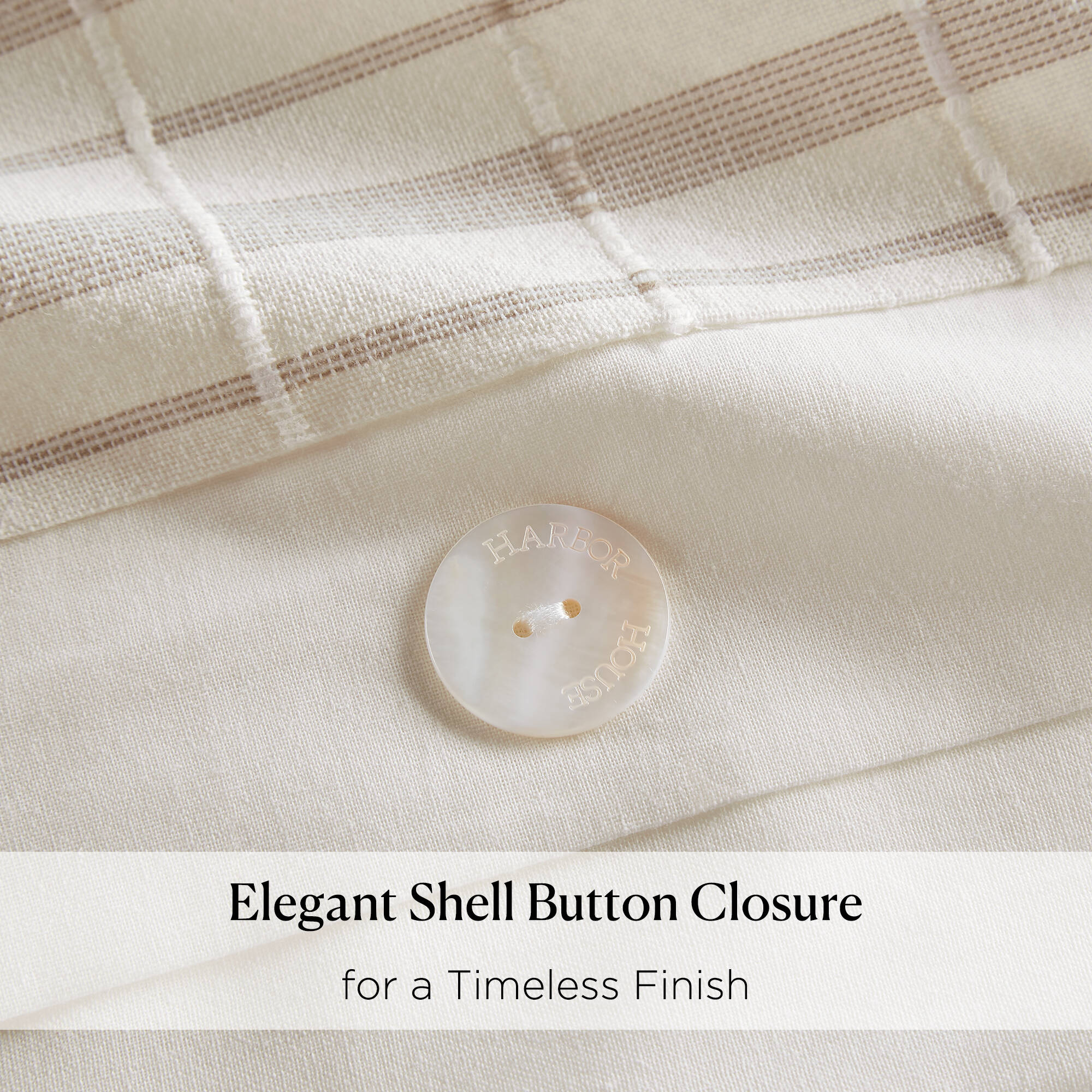Bring a relaxed, upscale cottage feel to your bedroom with this oversized cotton jacquard comforter set. Soft textured vertical weave and contrasting horizontal blue stripes on an ivory ground create subtle visual interest while the overfilled construction and hypoallergenic polyester fill deliver extra warmth and all-night comfort. Thoughtful details—matching shams, decorative pillows, and a coordinating bed skirt—complete a layered, curated look that’s easy to care for and safe for your family.