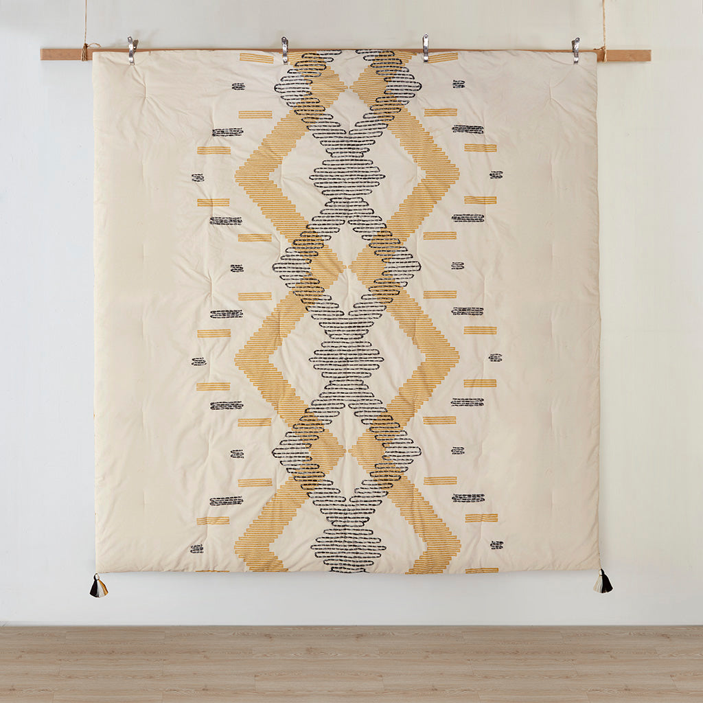 - Design: Yellow and grey geometric print with twisted yarn embroidery for subtle texture and visual interest.