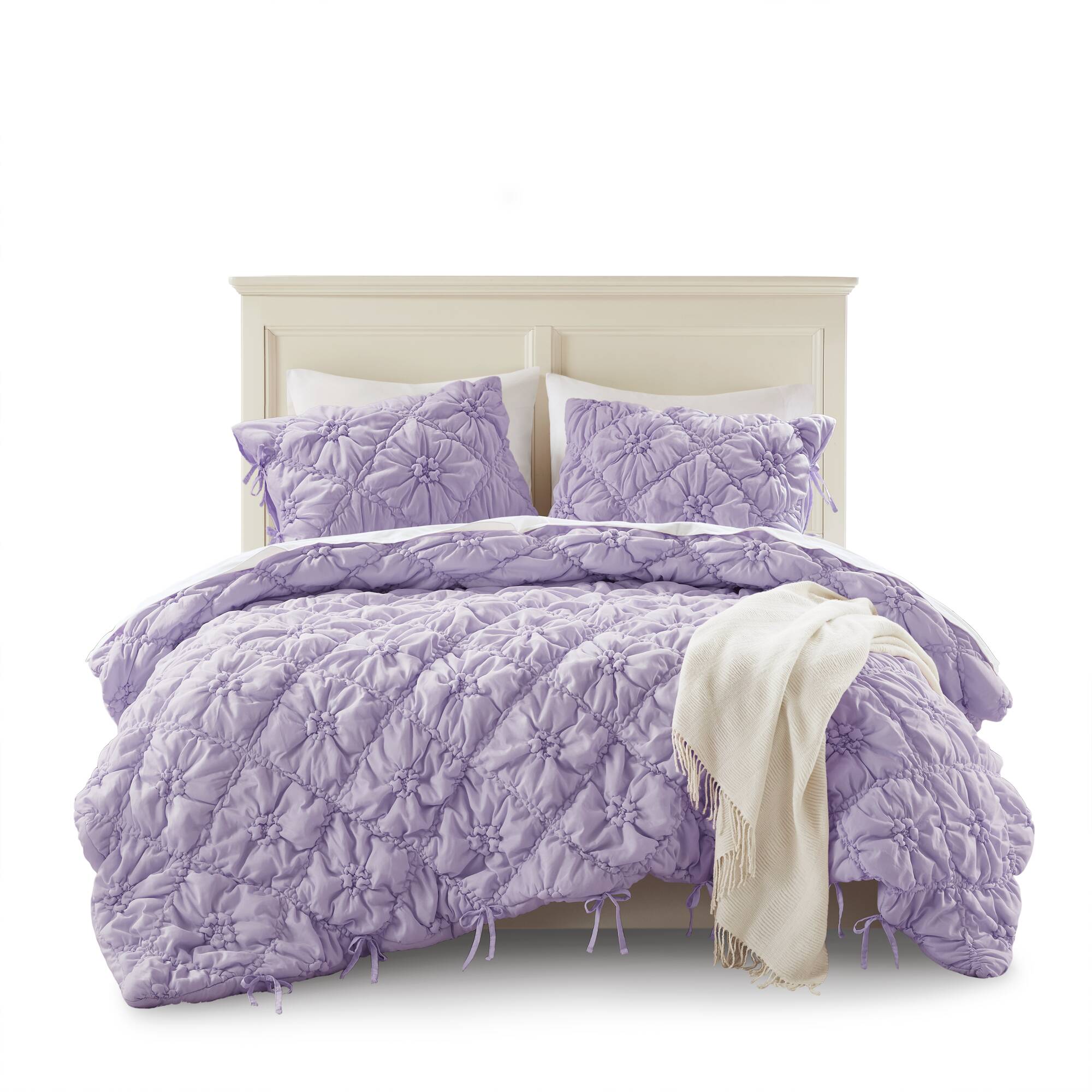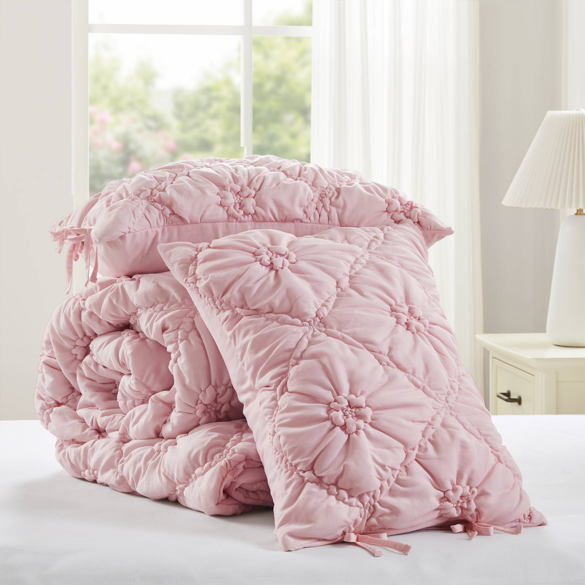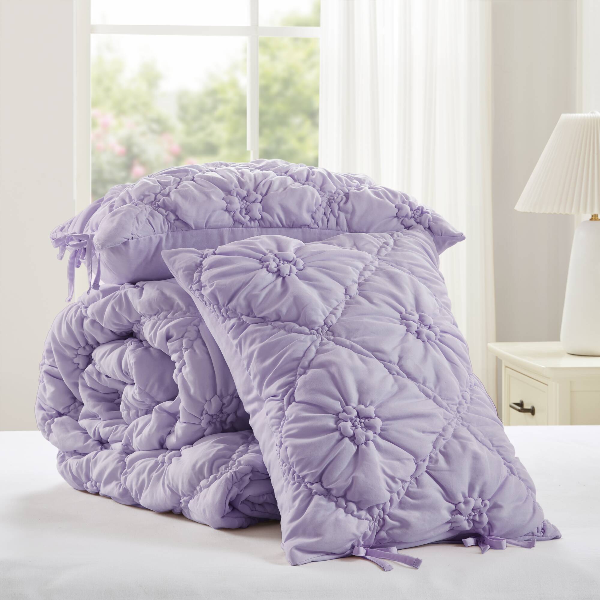 Wrap your bedroom in shabby-chic charm and cloud-like comfort with this three-piece floral comforter set. Thoughtfully designed details—puffy floral quilting, bow-tie accents, and elastic ruching—create a relaxed, full appearance while breathable brushed microfiber and lightweight plush fill deliver all-season warmth and easy-care convenience.