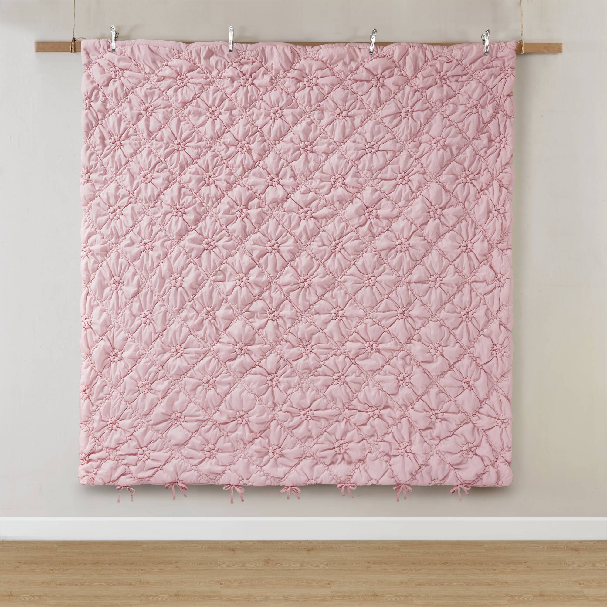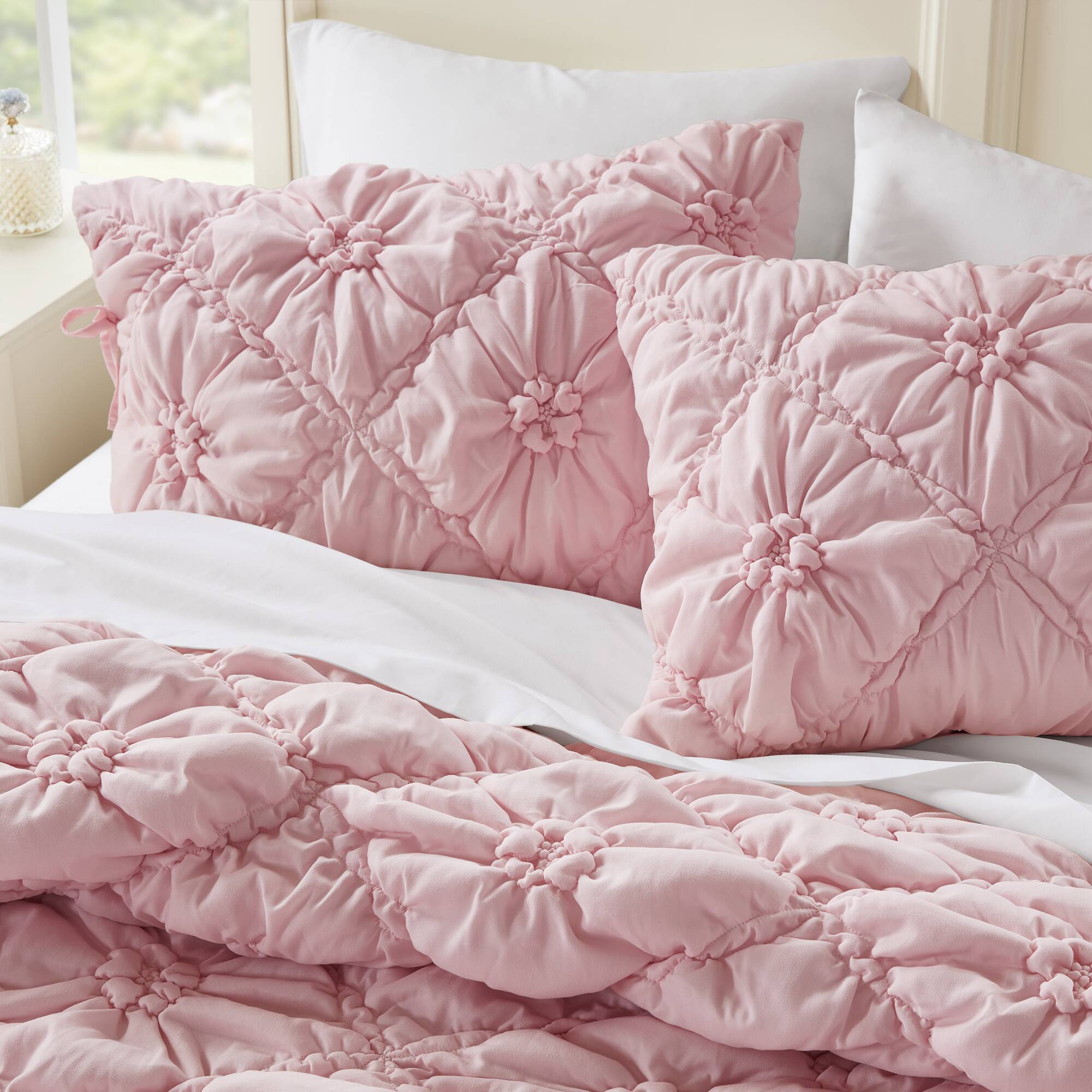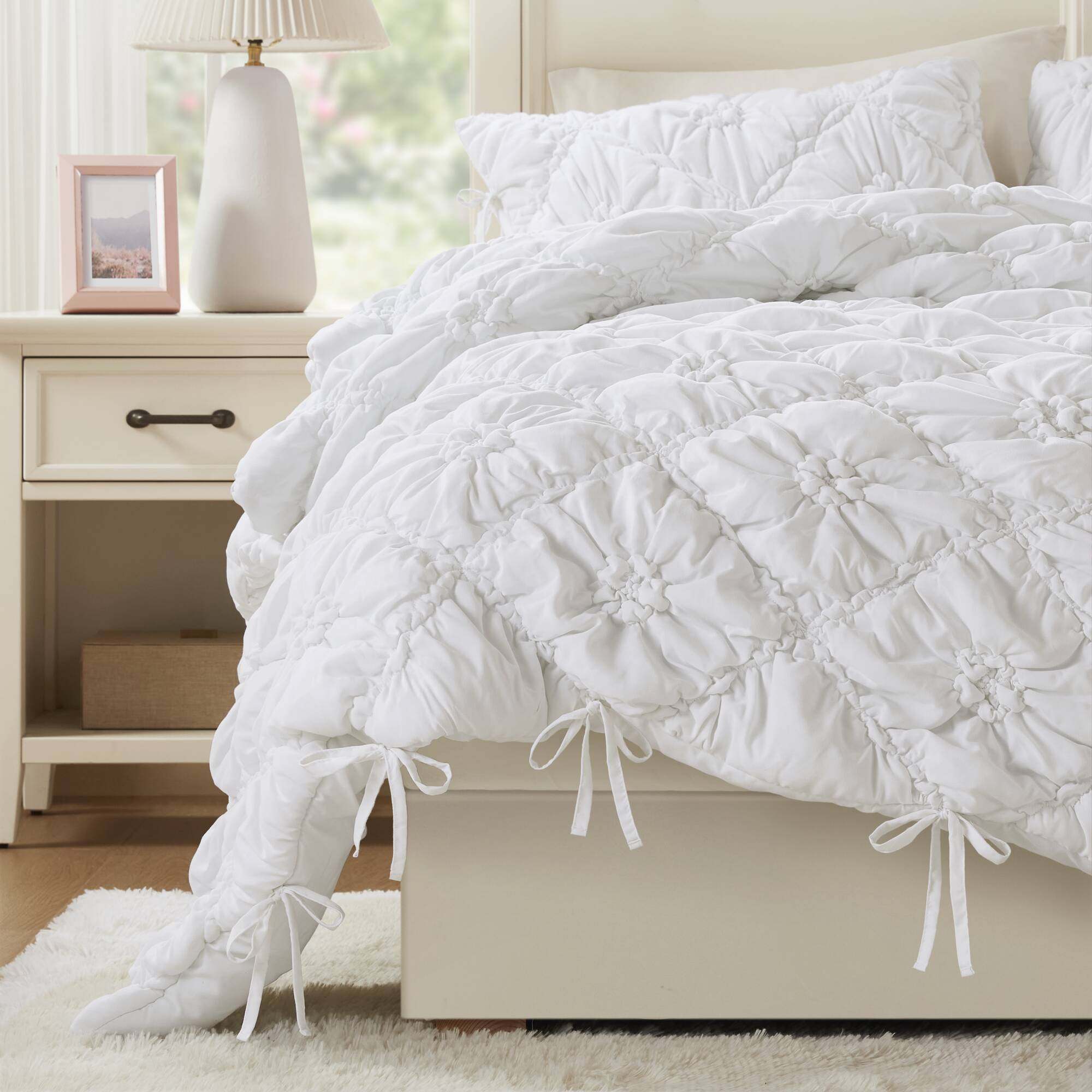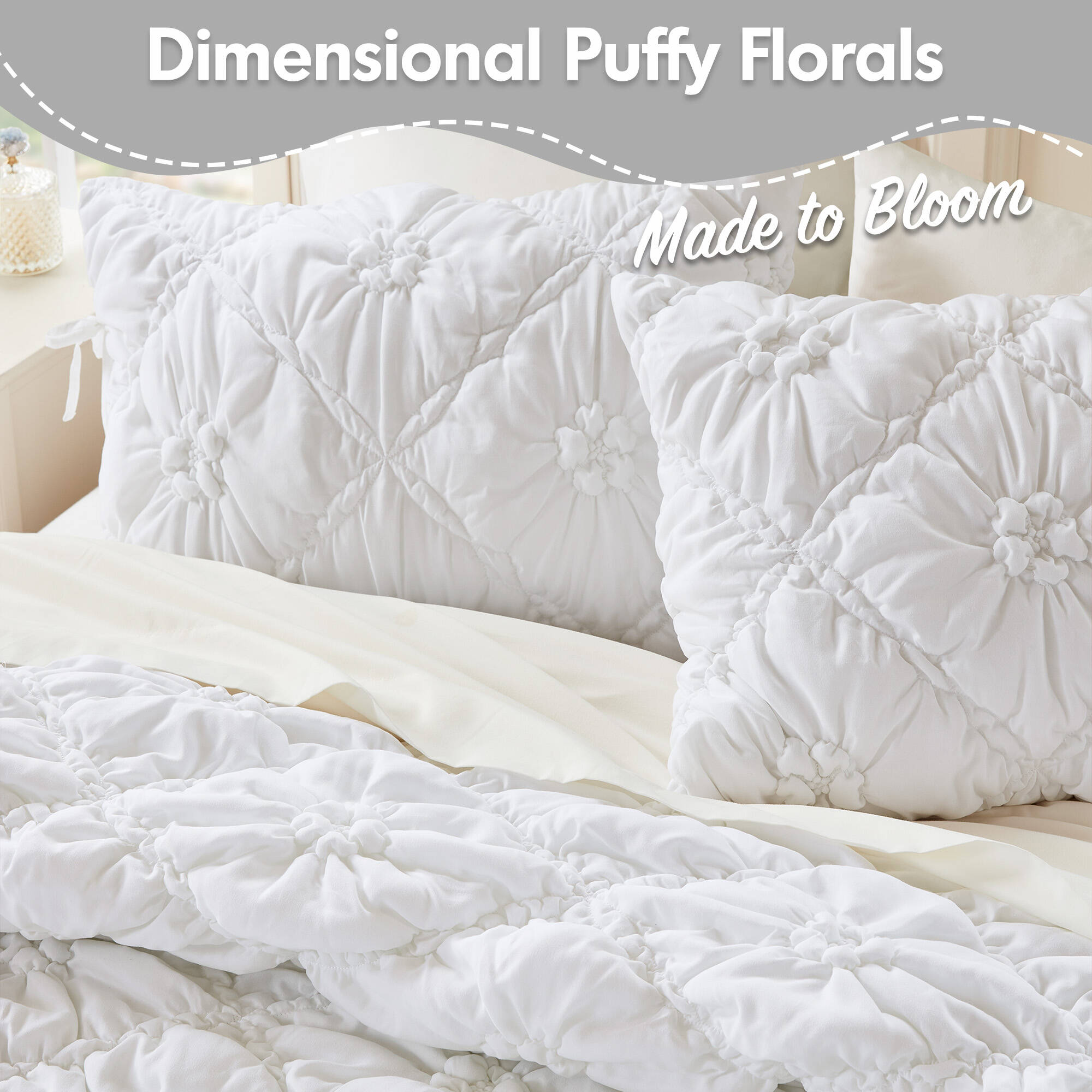 Wrap your bedroom in shabby-chic charm and cloud-like comfort with this three-piece floral comforter set. Thoughtfully designed details—puffy floral quilting, bow-tie accents, and elastic ruching—create a relaxed, full appearance while breathable brushed microfiber and lightweight plush fill deliver all-season warmth and easy-care convenience.