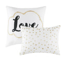 Refresh your bedroom with the modern glamour of the Raina Comforter Set. Featuring a metallic gold geometric print on a soft blush ground, this ensemble combines contemporary style with ultra-soft comfort. Coordinating shams and two embroidered decorative pillows with metallic and typographic details create a cohesive, layered look that's both chic and inviting. The set is finished with an antimicrobial treatment to help keep fabrics fresher longer.