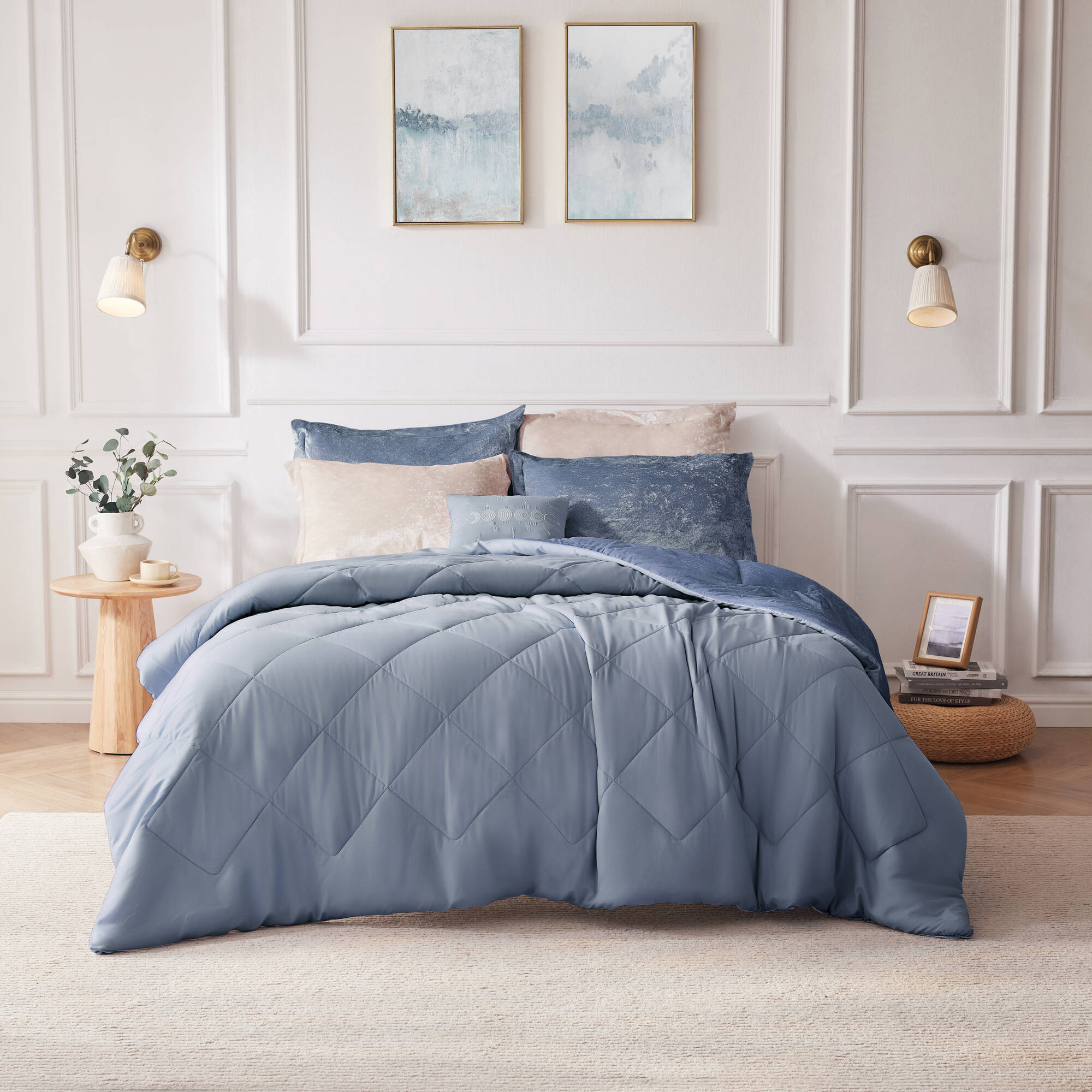 Transform your bedroom into a cozy, modern retreat with this plush crushed-velvet comforter set. Sumptuously soft and subtly lustrous, the navy comforter features diamond quilting for texture and refined style, while coordinating shams and an oblong decorative pillow complete the look. Hypoallergenic fill and machine-washable construction make this set as practical as it is elegant—perfect for adding warmth and sophisticated comfort to any bedroom decor.