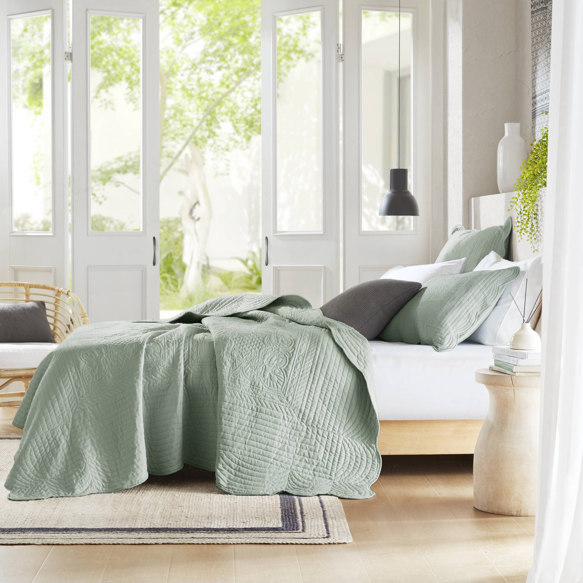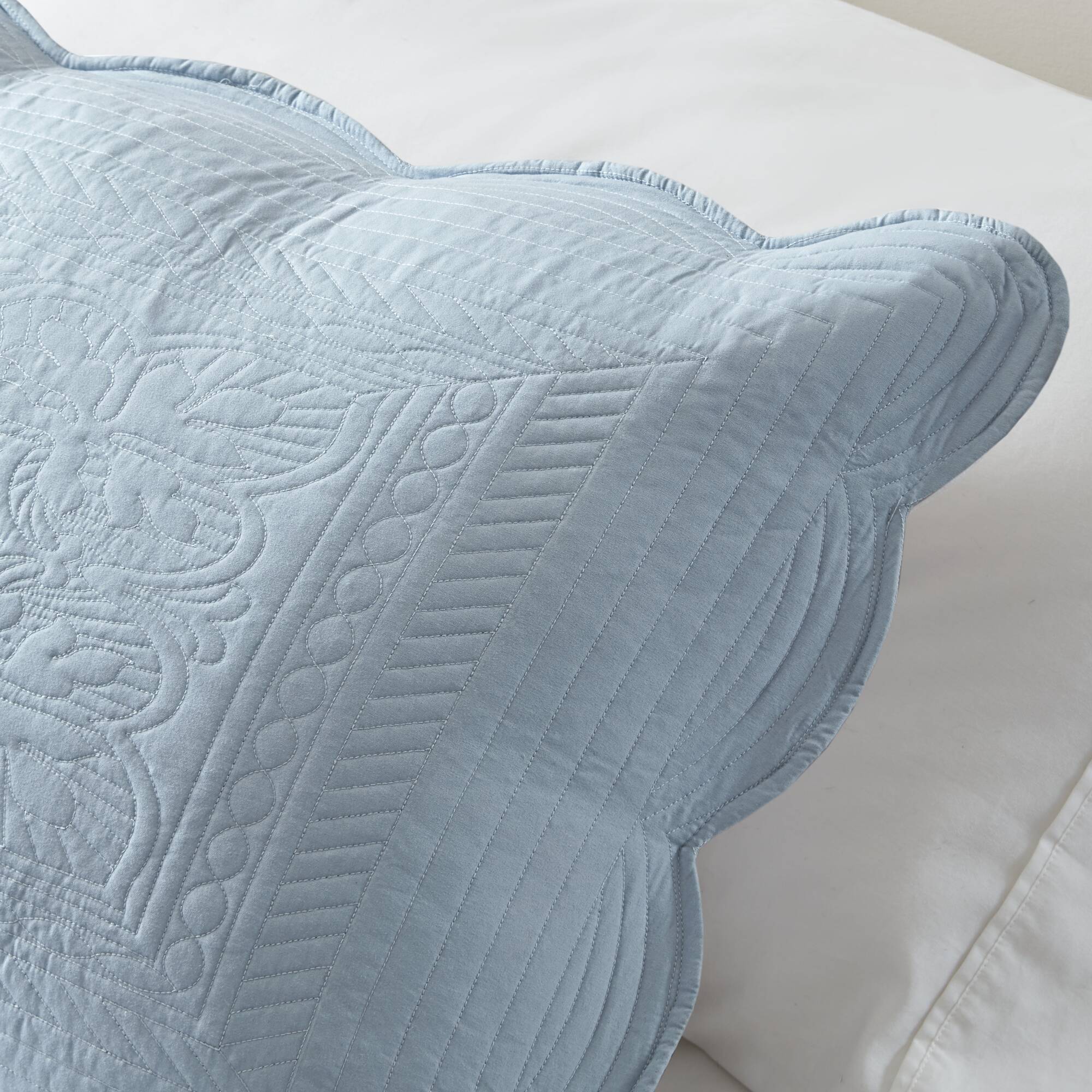 - Detailing: Classic stitched pattern with scalloped edges on both quilt and shams for an elegant, cottage-inspired finish.