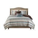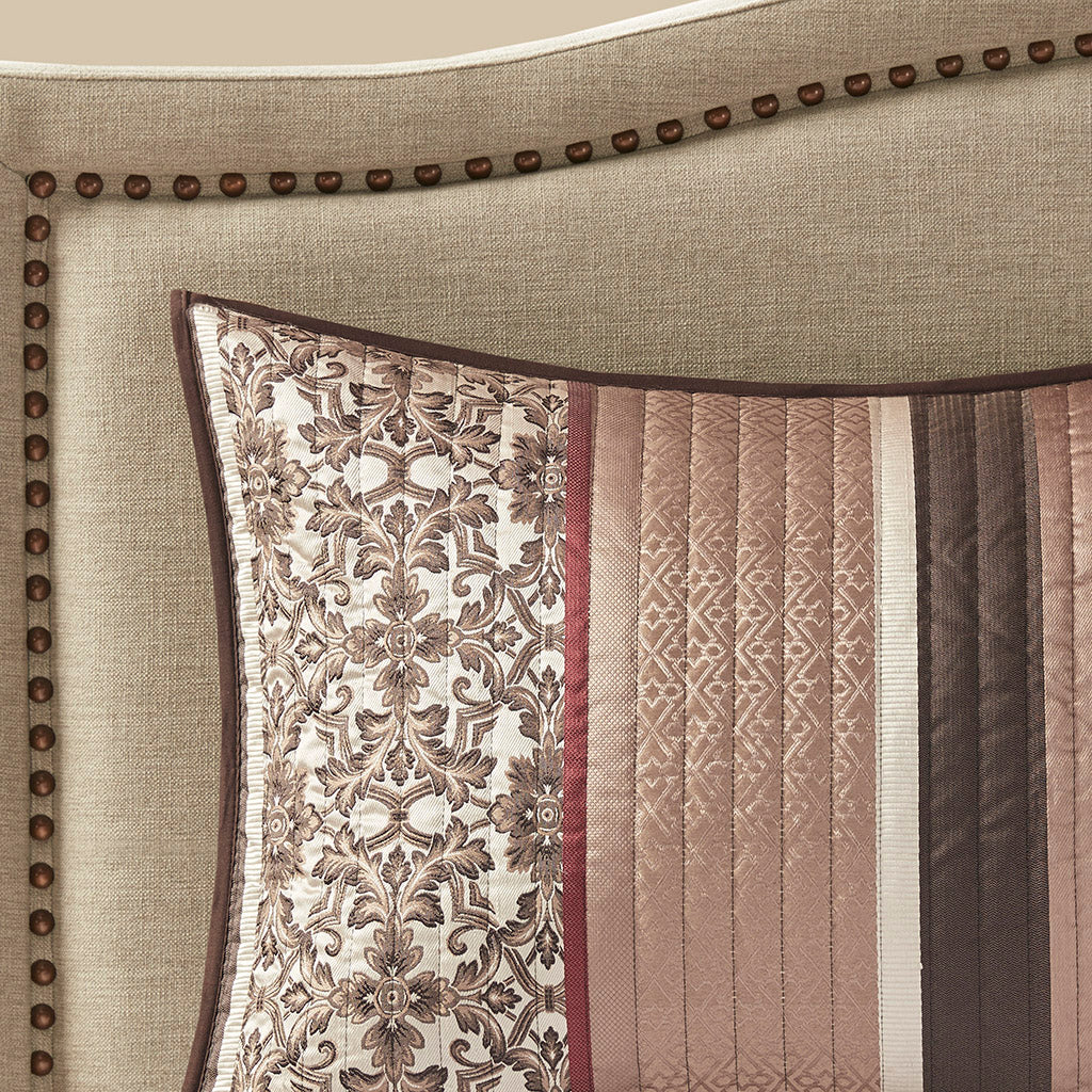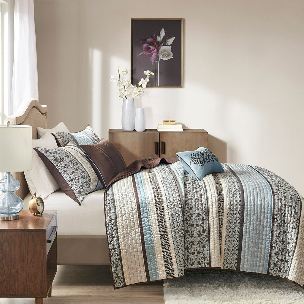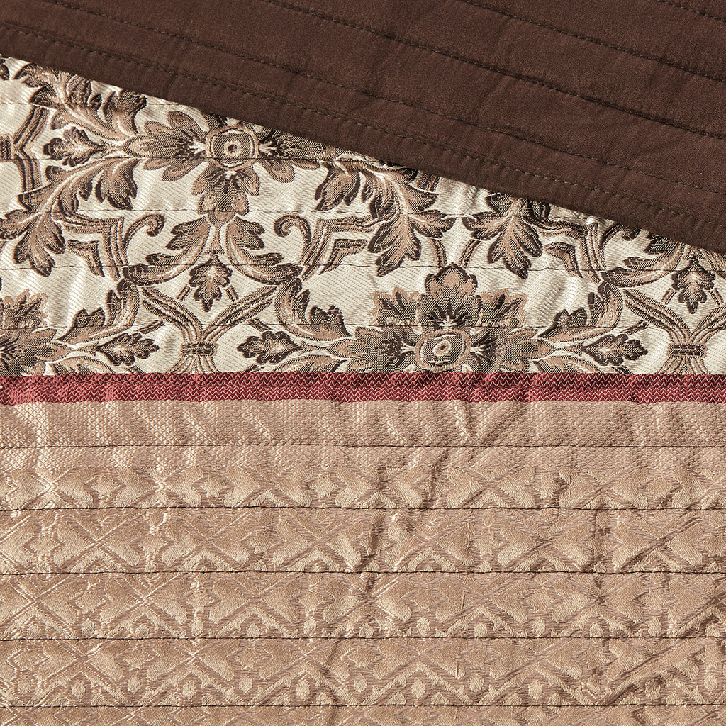 Refresh your bedroom with a refined, layered look—this 5-piece reversible jacquard quilt set combines rich texture, classic motifs, and coordinated accents to create a polished, hotel-quality aesthetic in minutes. The chocolate-brown base is enhanced with leaf, stripe, and medallion motifs, subtle channel stitching, and pops of blue for depth and visual interest. Two decorative pillows with pleating and embroidery complete the ensemble for a cohesive, upscale finish.
