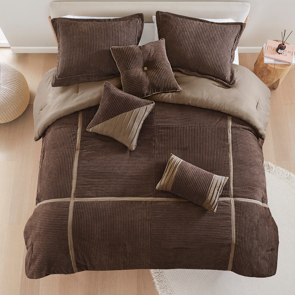 Wrap your bedroom in cozy, casual comfort with this 7-piece micro corduroy set that blends softness, warmth, and understated style. Soft brushed reverse fabric and taped, pieced construction give the comforter a textured, tailored look while remaining lightweight enough for year-round use. Tailored shams and coordinating pieces complete the polished, inviting bedding ensemble.