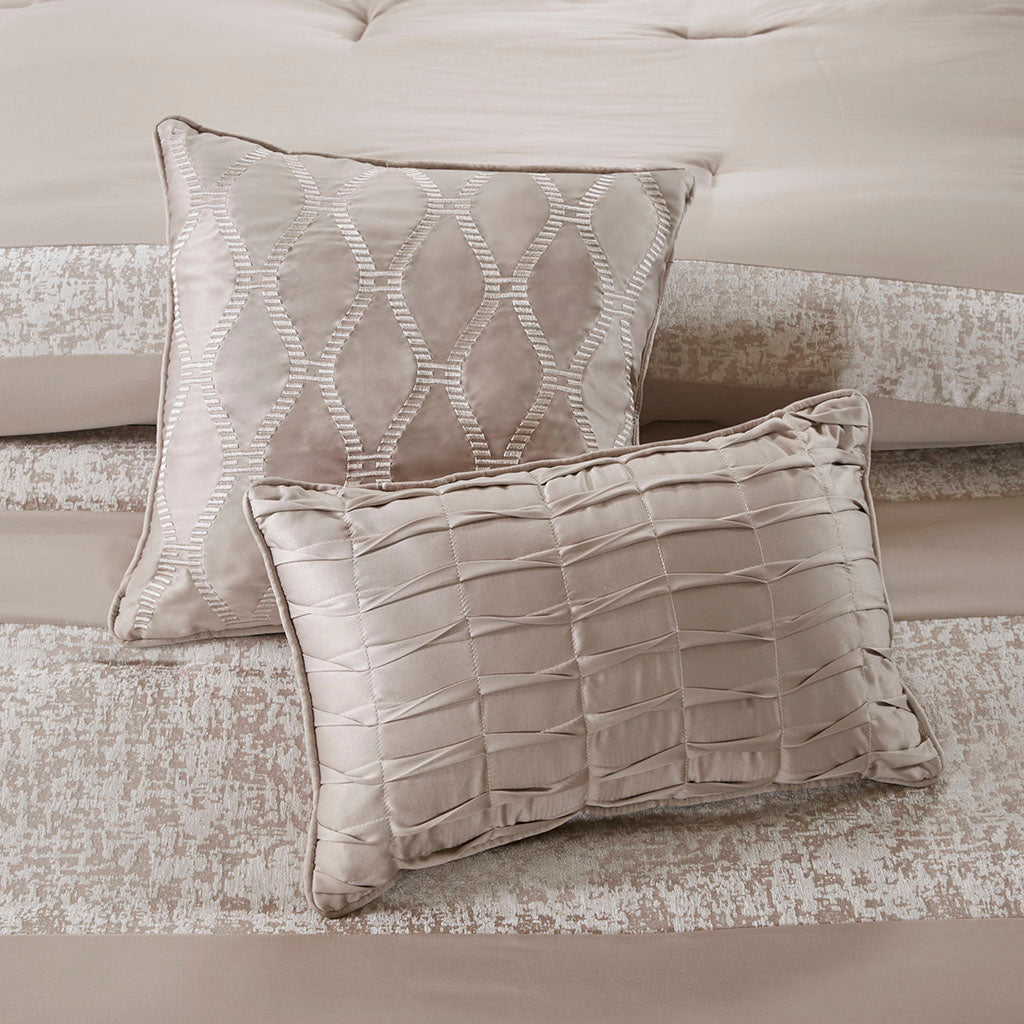 - Set components: 1 comforter, 2 shams, 2 square decorative pillows, 1 oblong decorative pillow, 1 bed skirt