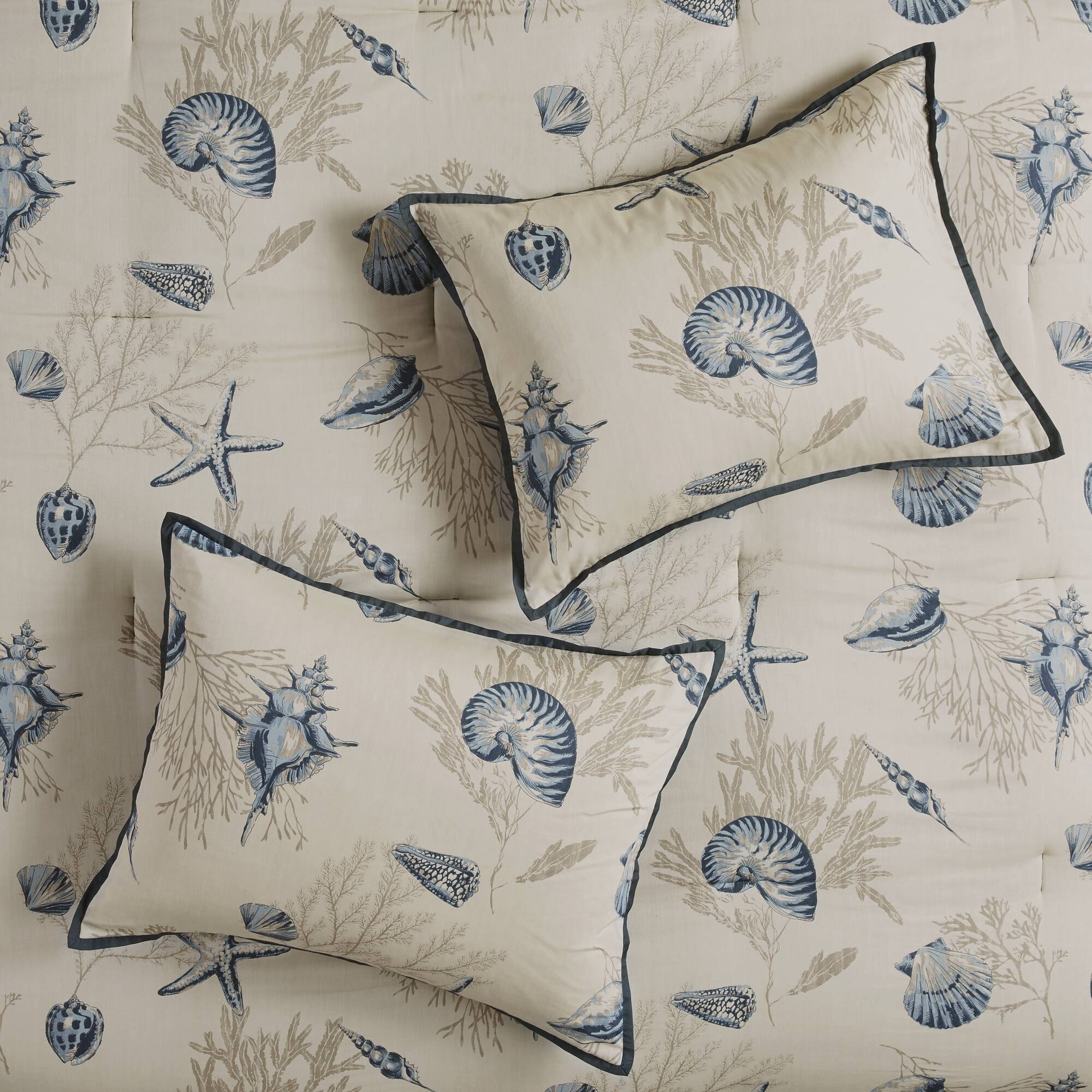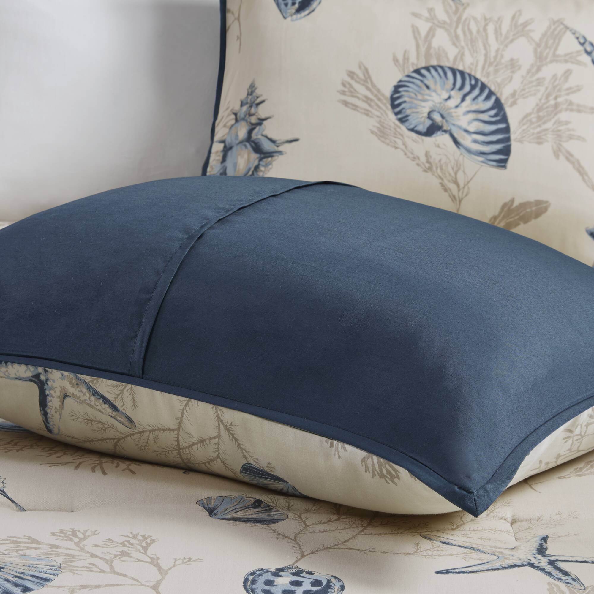 Transform your bedroom into a soothing coastal retreat with this 7-piece comforter ensemble. Crafted from soft 200-thread-count cotton sateen, the set blends seashell and coral motifs in layered blues and deep taupe on an ivory background for a relaxed, beach-inspired look. The reverse side offers a coordinated dark-blue ground for easy styling, while three decorative pillows add texture and tailored detailing through pleats and embroidery.