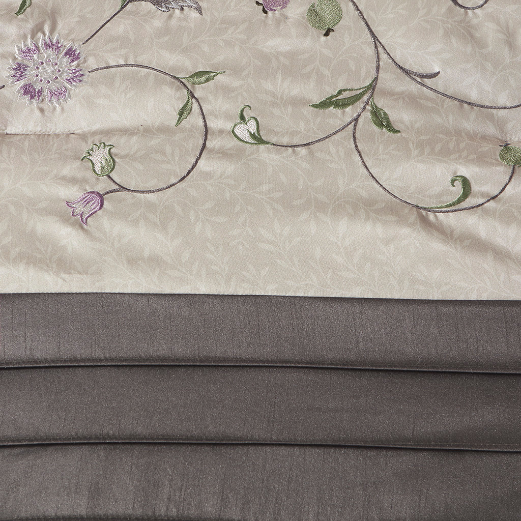 Elevate your bedroom with the Serene Bedding Collection — a refined 7-piece comforter set that blends contemporary color-blocking with delicate embroidery for a cohesive, polished look. Lustrous polyester dupioni fabric gives the comforter and shams a subtle sheen that catches light, while embroidered floral detailing and coordinated decorative pillows add texture and visual interest for an inviting, finished aesthetic.