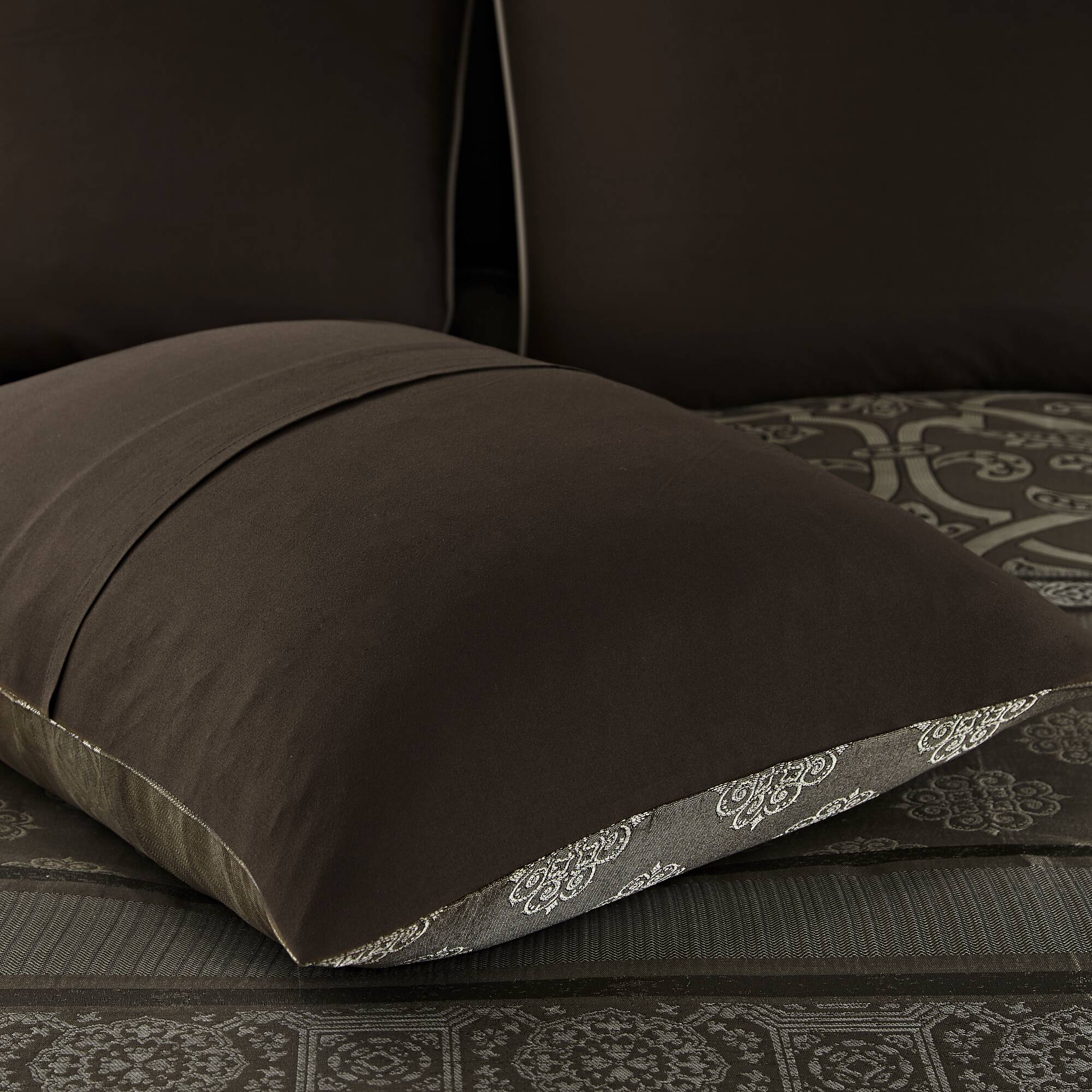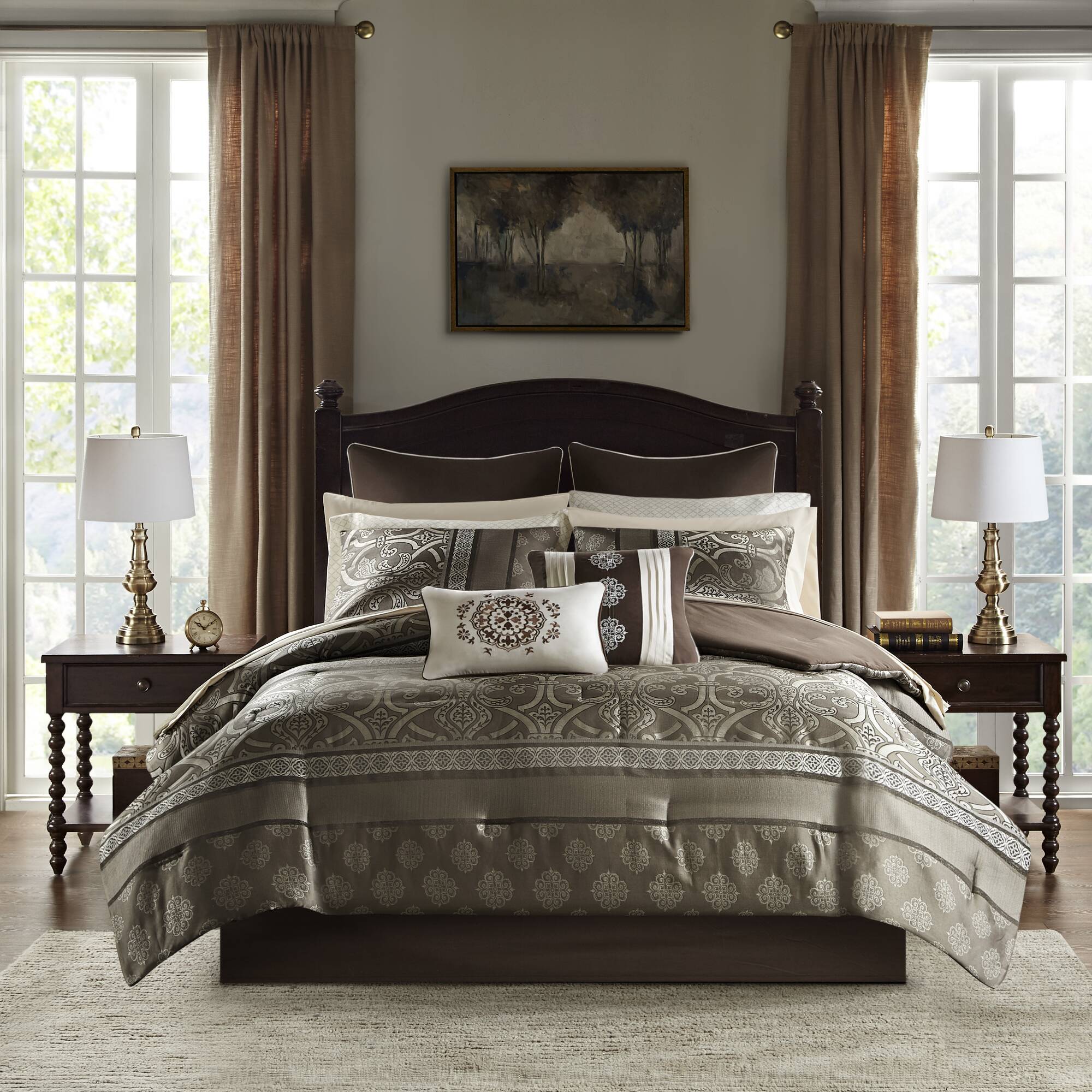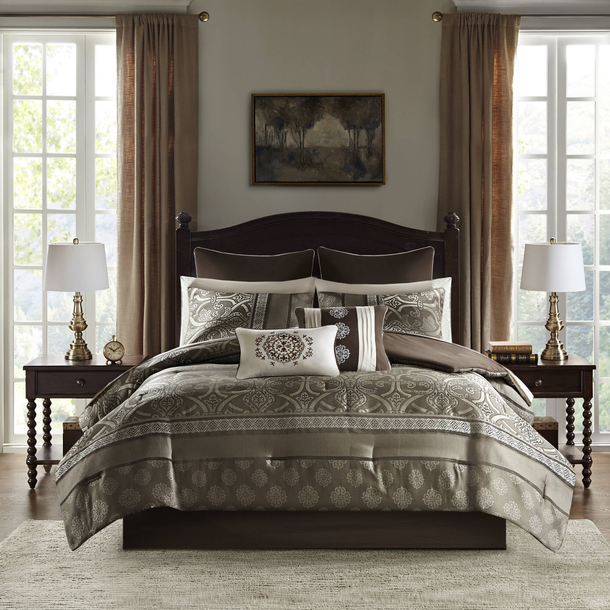 Transform your bedroom into a timeless retreat with this elegant jacquard bedding collection. Combining classic patterning, rich brown tones, and thoughtful details, the ensemble delivers coordinated style and easy-care performance—complete with two full sheet sets for added value and convenience.