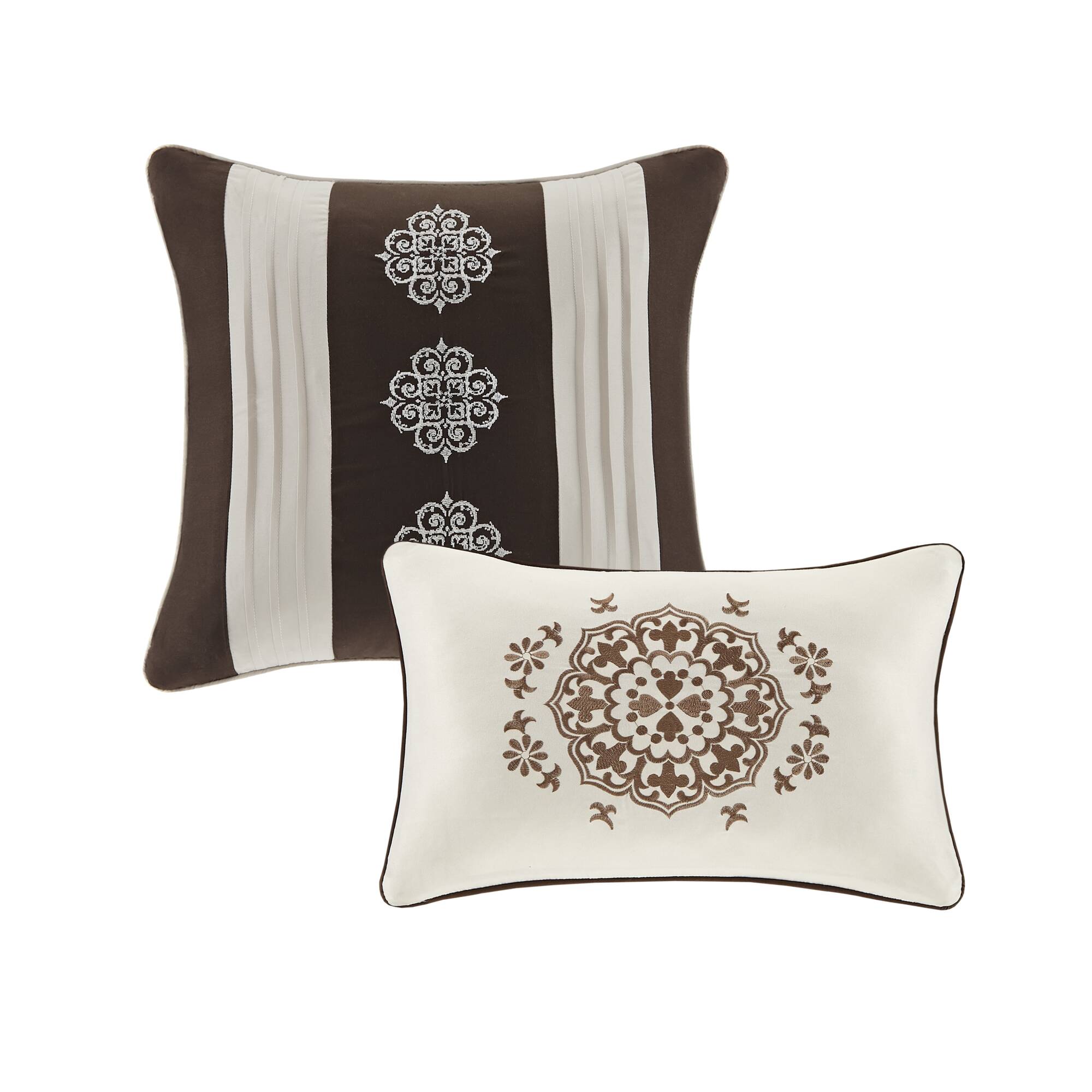 - Included pieces (16-piece set): 1 comforter, 2 shams, 2 Euro shams (dark brown), 3 decorative pillows with embroidery and pintuck details, 1 solid brown bedskirt, and two complete sheet sets (fitted, flat, and pillowcases).