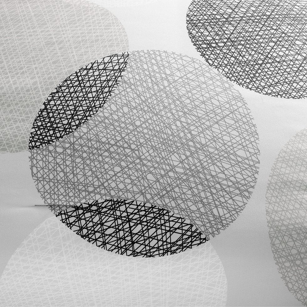 - Design: Modern geometric circle print in dark, white, and light gray on the comforter and sheets; solid gray bed skirt and embroidered accent pillow provide refined contrast.