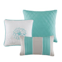 - Design: Floral print in white and aqua on a solid taupe grey comforter and shams for a sophisticated, transitional look; coordinated decorative pillows include an aqua/grey stripe, embroidered grey & aqua floral, and a solid aqua pillow.