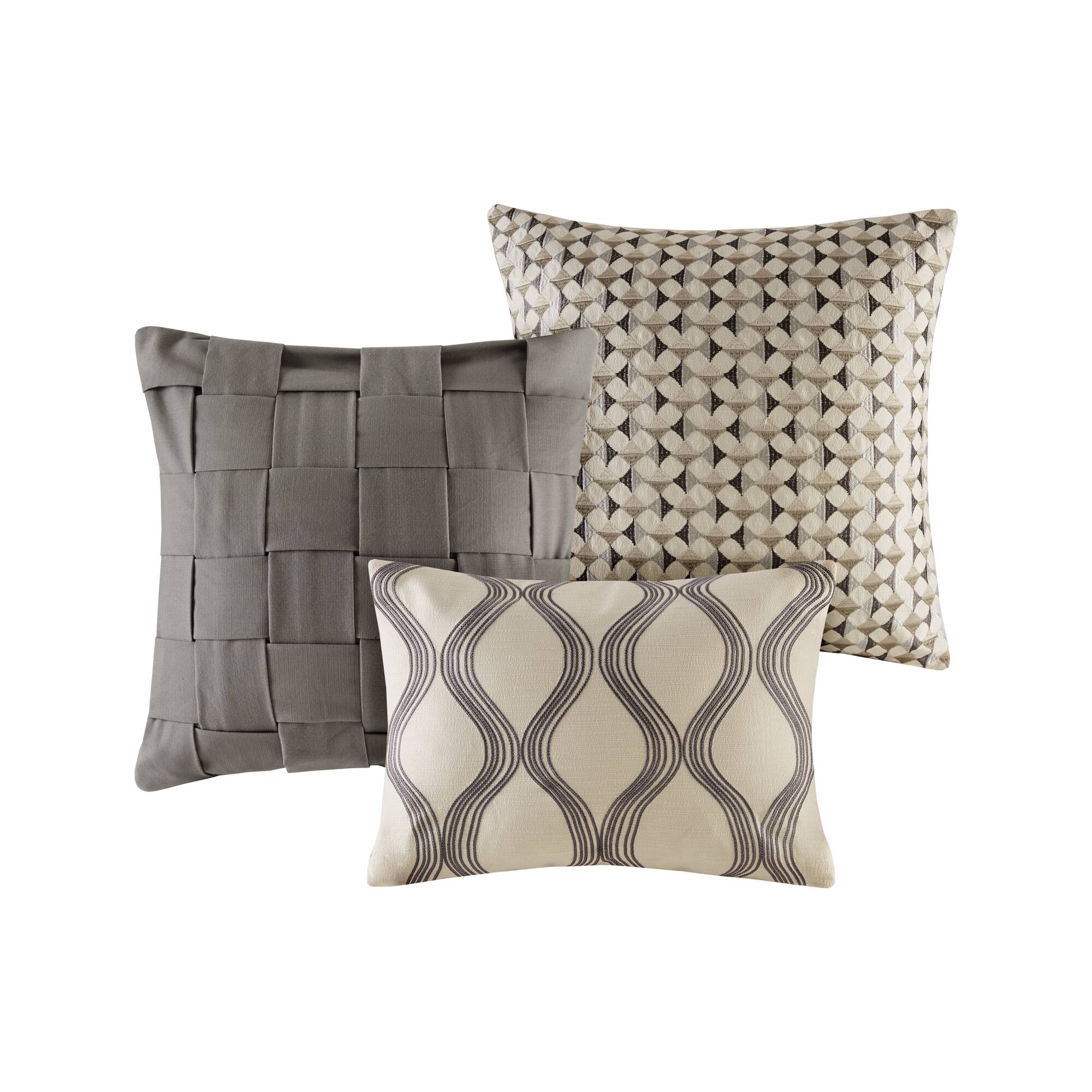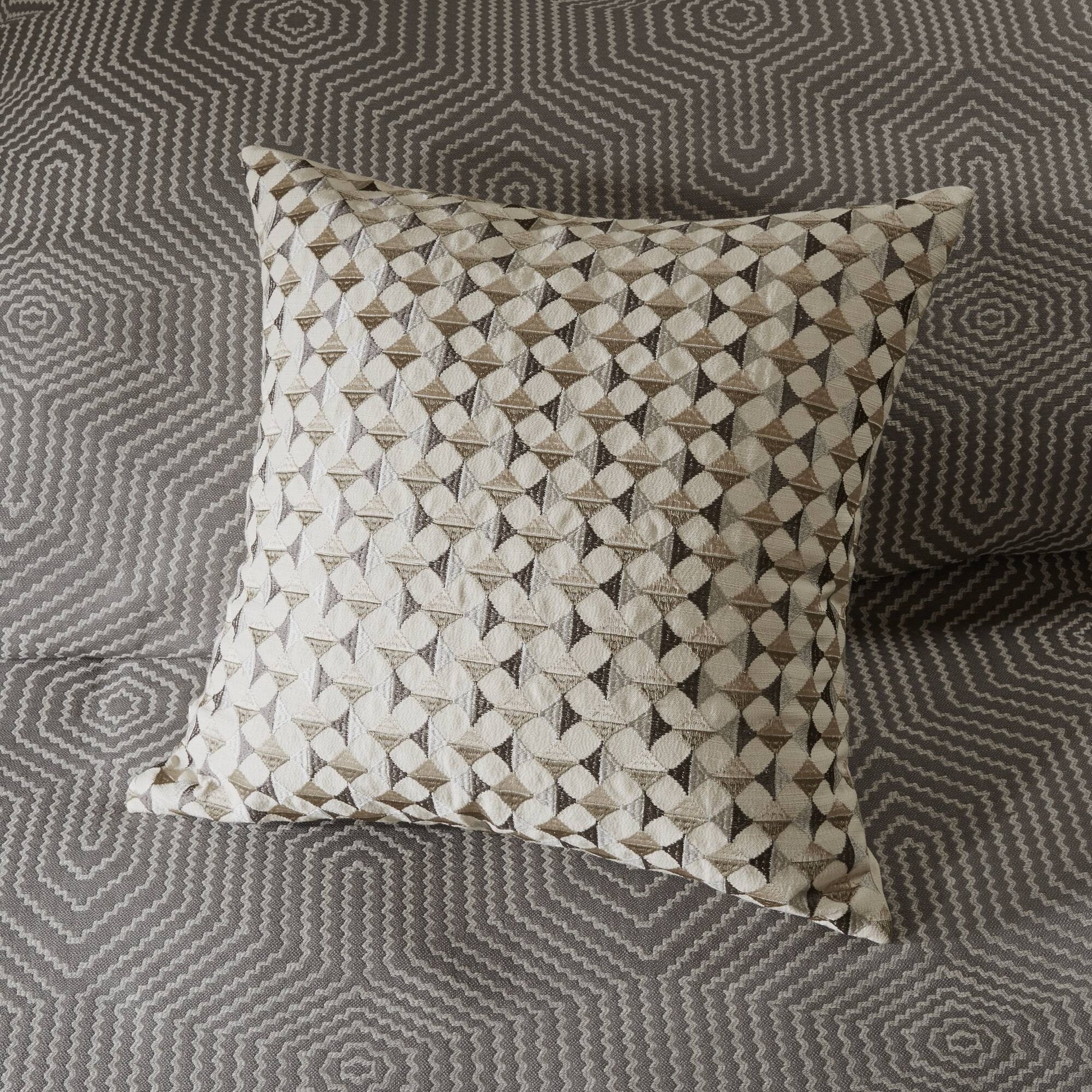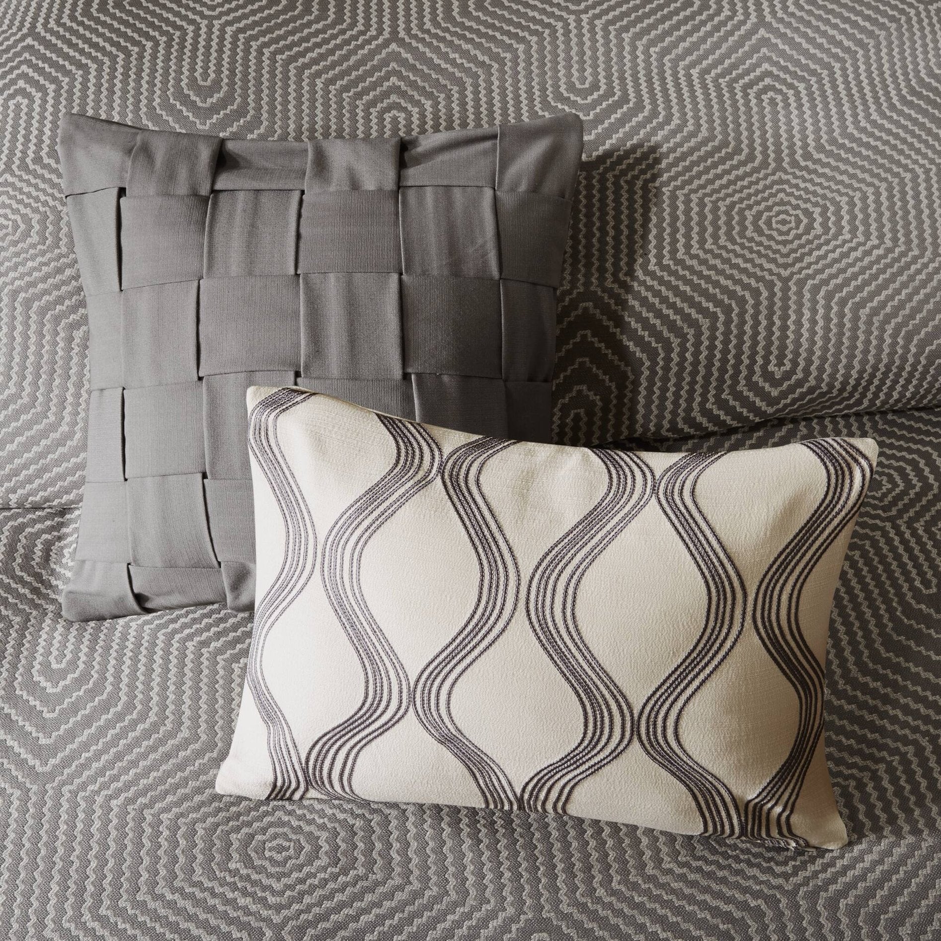 - Includes: comforter, 2 standard shams, 2 Euro shams (3 Euro shams in King), and 3 decorative pillows in coordinating grey and ivory hues.