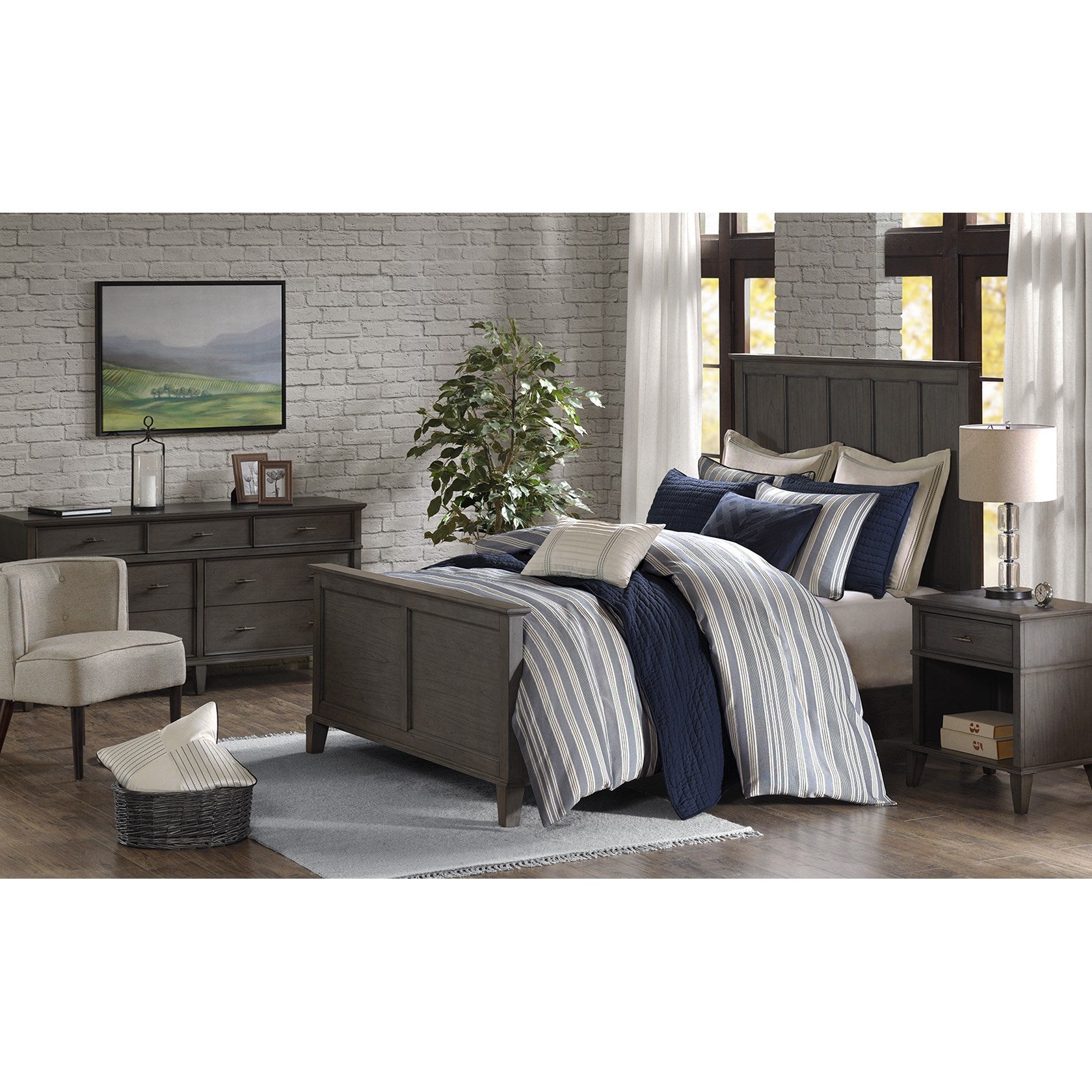 - Design: Navy and ivory woven jacquard stripe with mixed weaves and embroidered Euro shams for a textured, on-trend farmhouse aesthetic