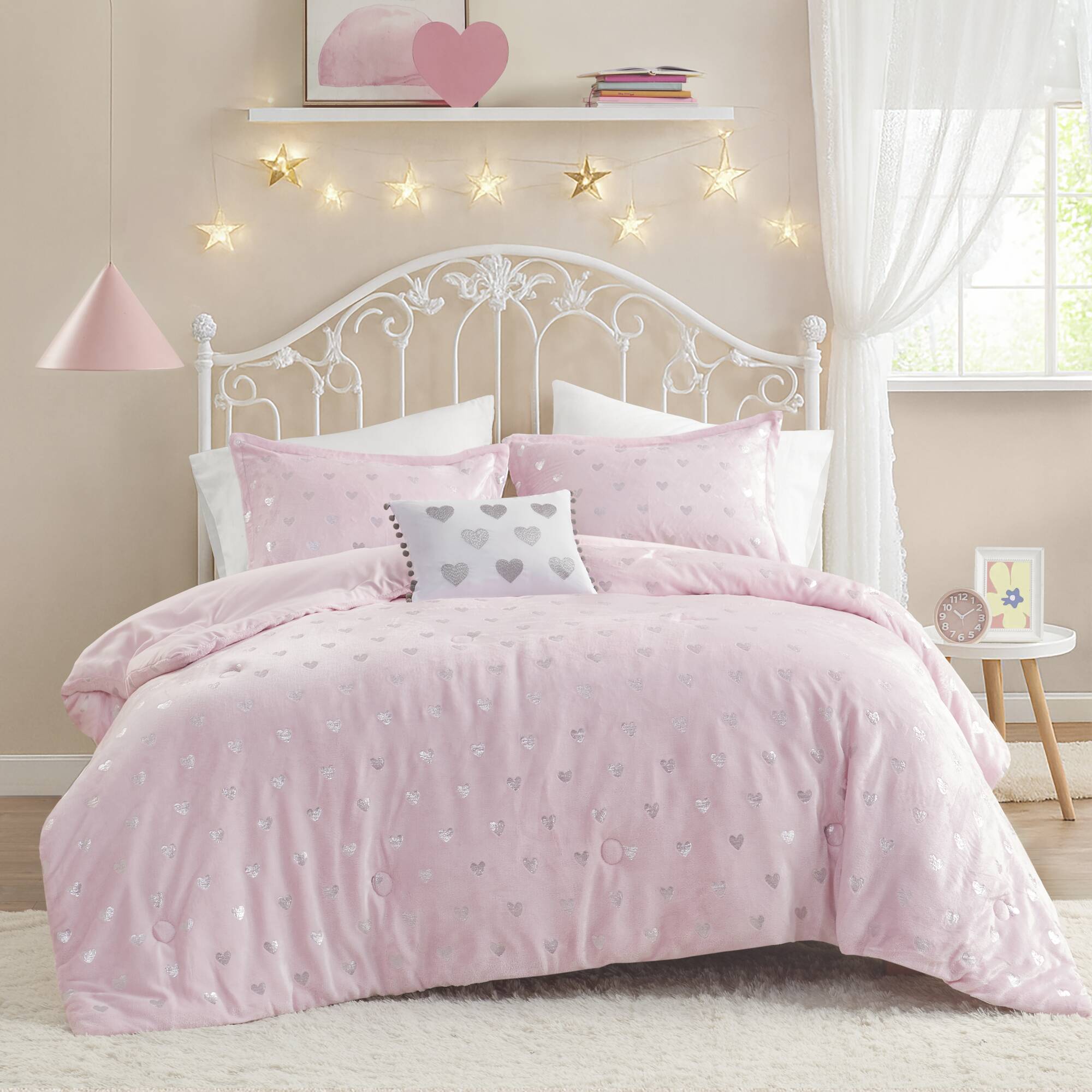 Brighten your bedroom with the Rosalie metallic printed plush comforter set, a cozy and playful ensemble that blends soft plush texture with a shimmering silver heart motif. Designed for casual, cheerful decor, this OEKO-TEX certified set is crafted to be gentle on skin and free from harmful substances. The included oblong throw pillow with pompom trim and heart accents adds a charming finishing touch, while the plush fabric provides warmth and a luxurious feel. Note: items may arrive rolled or compressed and will benefit from fluffing or light steaming to remove wrinkles.