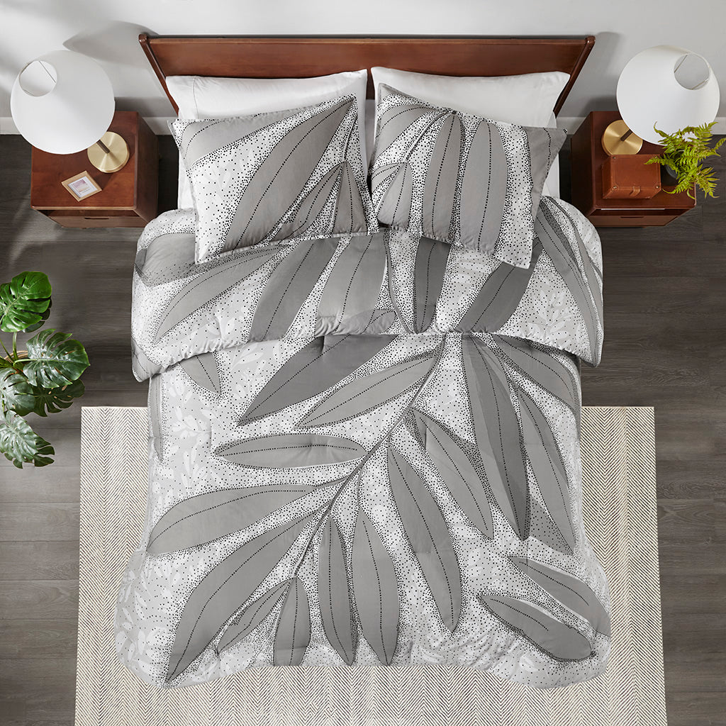 Bring nature indoors with this refined botanical comforter set that blends contemporary styling with sustainable materials. Neutral grays and crisp whites form a layered botanical pattern that adds depth and a calm, sophisticated look to any bedroom while offering easy-care performance and allergy-friendly comfort.