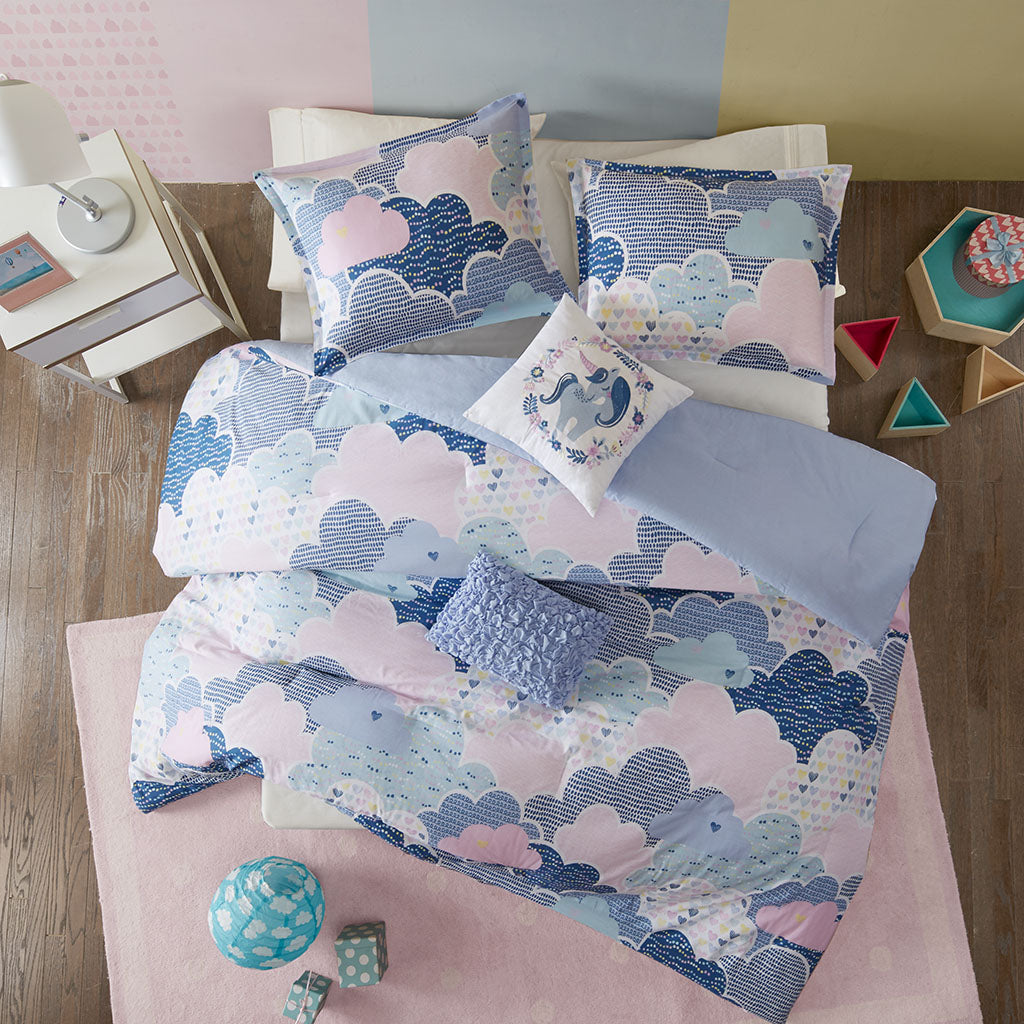 Bring playful, cozy design to your child's bedroom with this whimsical cloud-and-unicorn cotton comforter set. Soft, breathable 100% pre-shrunk cotton provides comfy year-round sleep while OEKO-TEX certification and an antimicrobial finish give added peace of mind through lasting freshness and reduced odor-causing bacteria. The reversible comforter lets you switch from printed charm to a solid look, and the coordinating decorative pillows add texture and personality to complete the look.