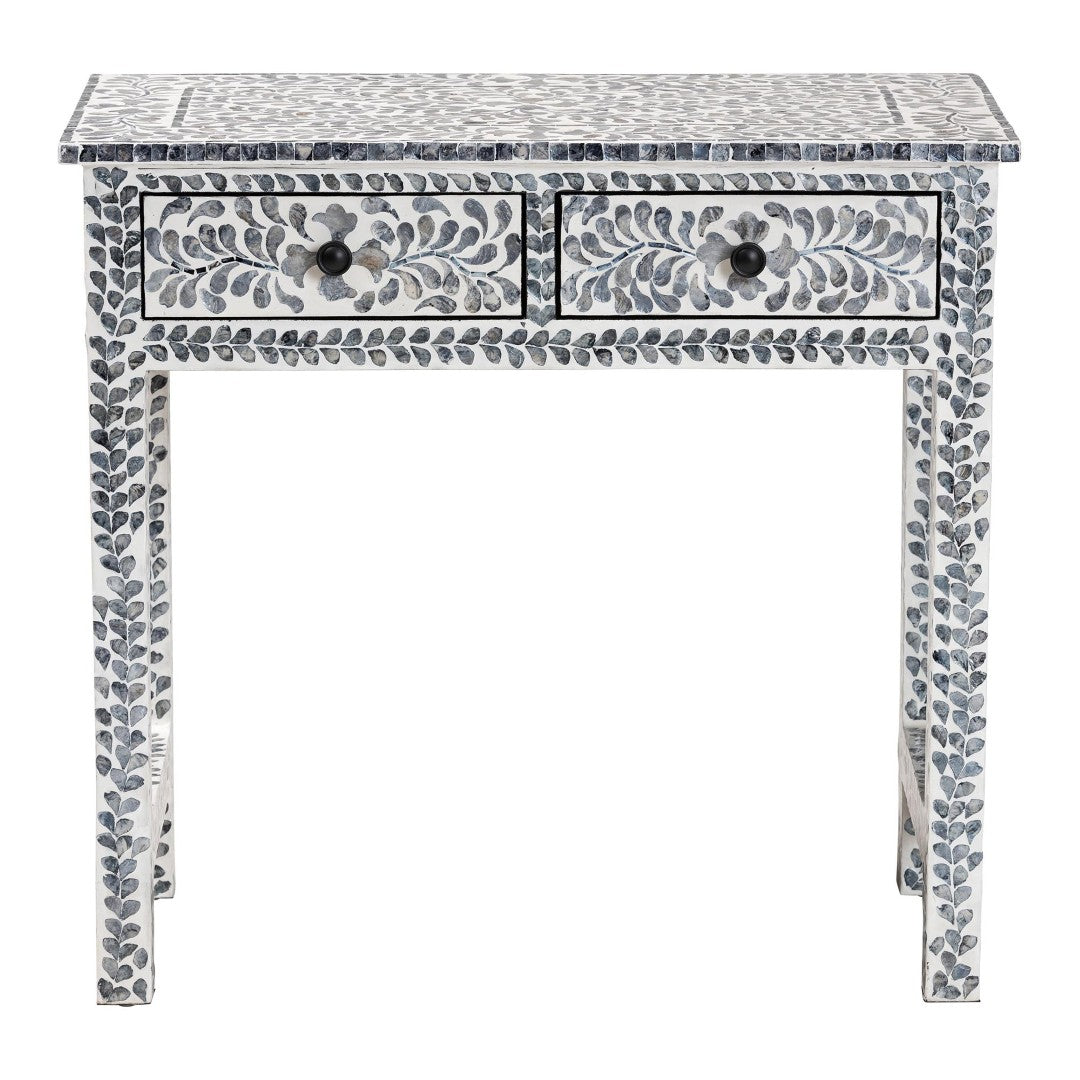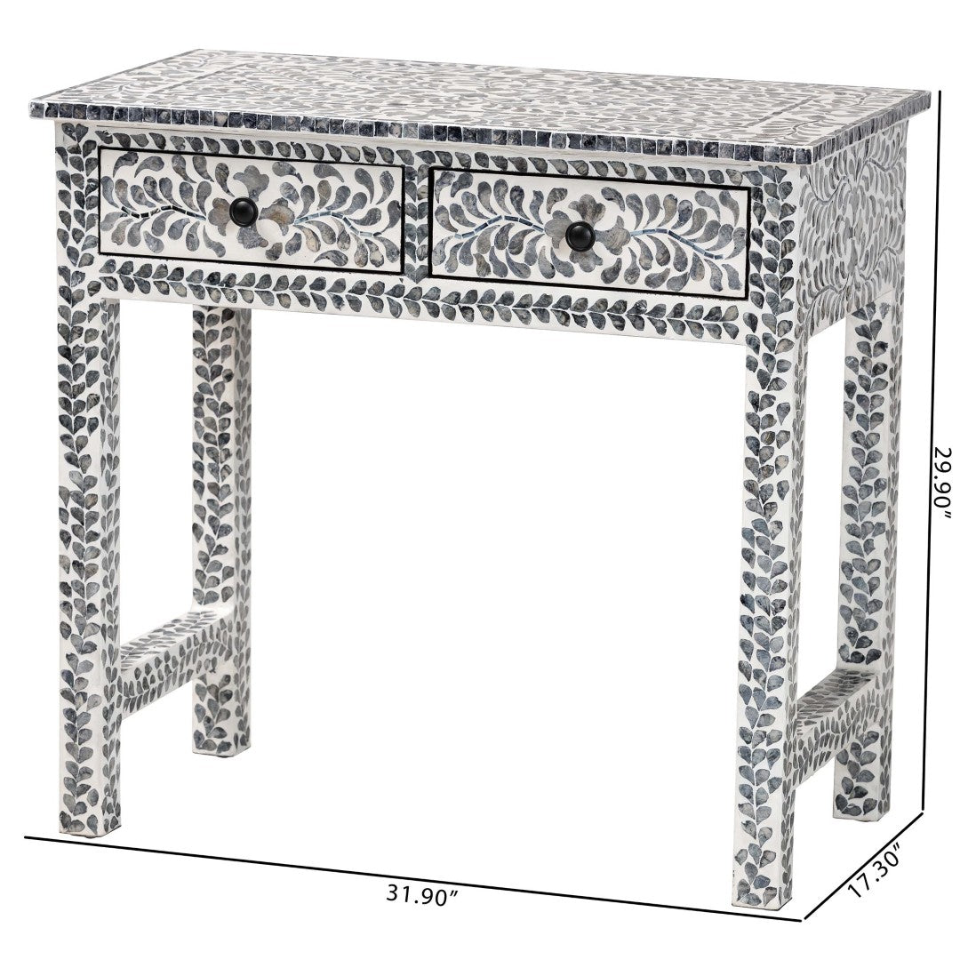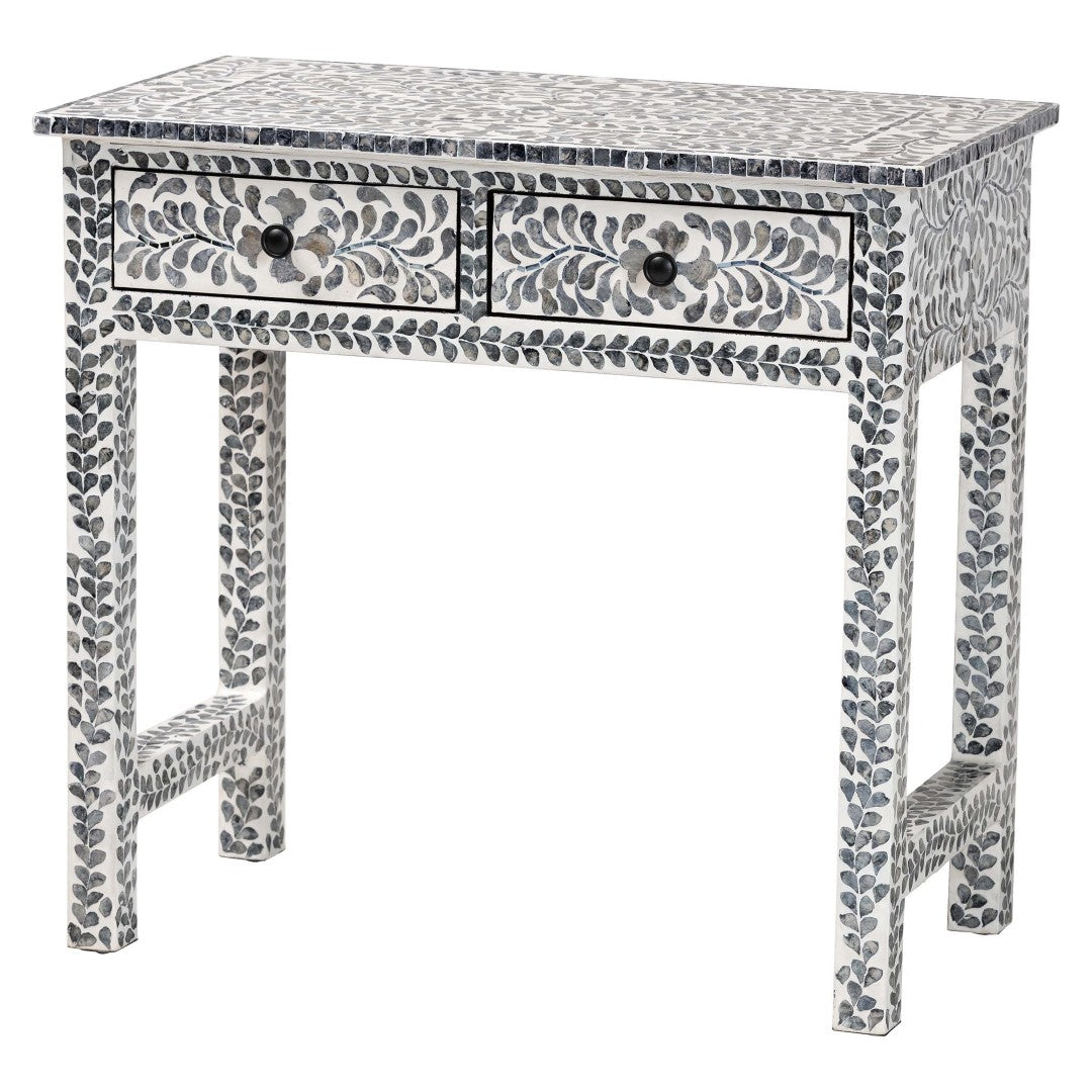 Bring coastal charm and artisanal detail to your entryway, hallway, or living room with this Diata console table. Handcrafted in Vietnam, the piece pairs a sturdy engineered wood frame with natural Capiz shell arranged in a floral mosaic pattern, creating an elegant black-and-white aesthetic that functions as both furniture and decorative focal point. Two smooth-gliding drawers provide tidy storage while the broad top offers ample display space; the table ships fully assembled for easy placement.