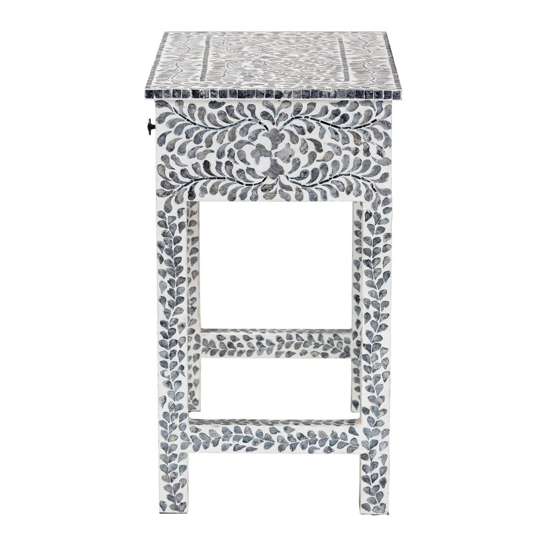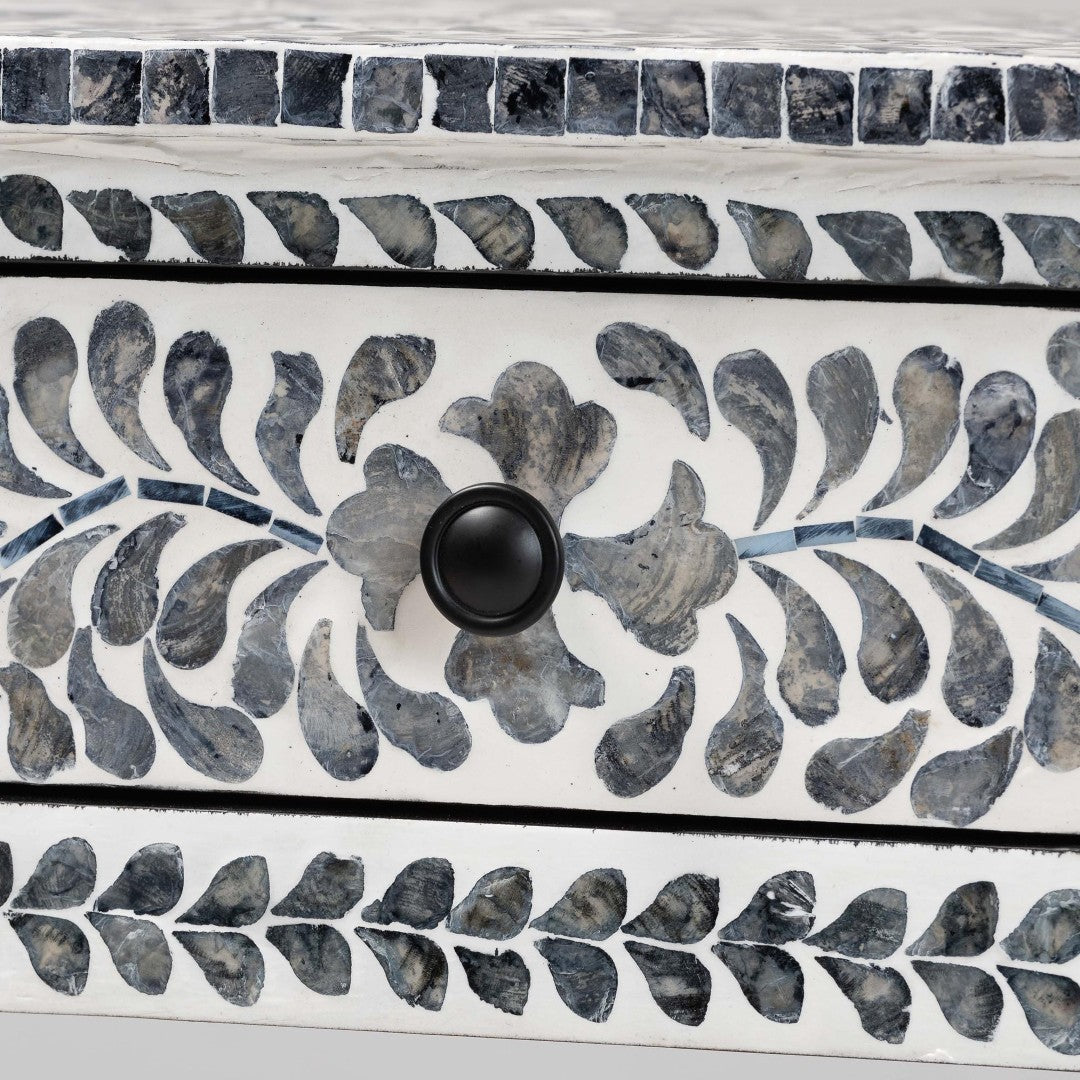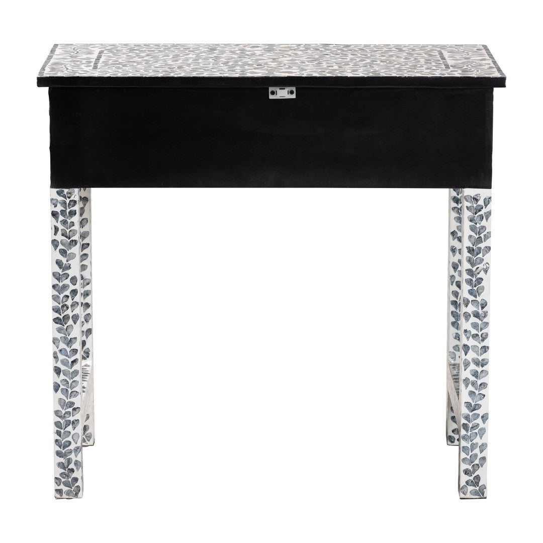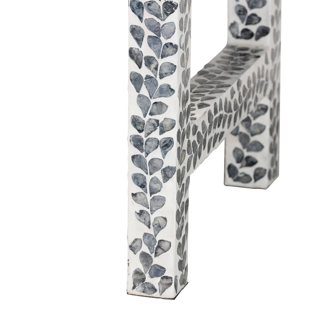 Bring coastal charm and artisanal detail to your entryway, hallway, or living room with this Diata console table. Handcrafted in Vietnam, the piece pairs a sturdy engineered wood frame with natural Capiz shell arranged in a floral mosaic pattern, creating an elegant black-and-white aesthetic that functions as both furniture and decorative focal point. Two smooth-gliding drawers provide tidy storage while the broad top offers ample display space; the table ships fully assembled for easy placement.