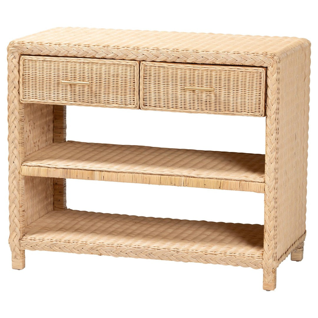Bring a calm, Japandi-inspired aesthetic to your entryway, living room, or bedroom with this Lanica console table. Handmade in Indonesia from mahogany and sustainably sourced natural rattan, its braided rattan detailing and solid wood frame combine rustic texture with refined, coastal-modern lines. Two drawers and two open shelves provide organized storage and display options, while the fully assembled design makes setup effortless.