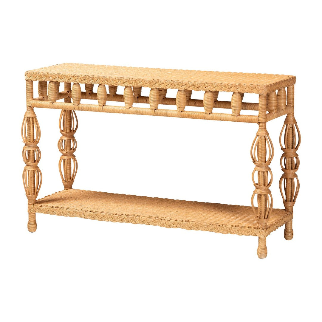 Bring coastal boho charm and handcrafted artistry to your entryway or living room with this handwoven rattan console table. Made in Indonesia from sustainably sourced natural rattan with acacia and engineered wood support, the table blends openwork weaving, braided detailing, and flared legs for an airy yet structured silhouette that complements modern and rustic interiors. It arrives fully assembled and is designed to maximize style and function in narrow spaces.