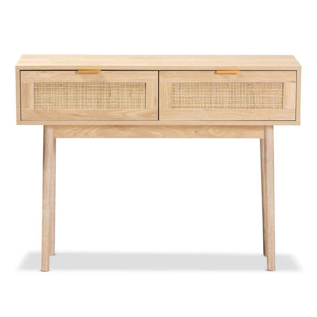 Add a touch of mid-century charm to your entryway or living space with this stylish console table. Clean lines, a light oak brown finish, and woven rattan drawer faces combine for a warm, retro-inspired look, while practical details—like two storage drawers and a wide tabletop—make it both decorative and functional. The gold-tone metal handles and angled legs complete the vintage-modern aesthetic, offering a versatile piece that complements a variety of interiors.