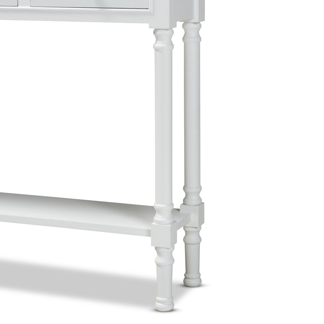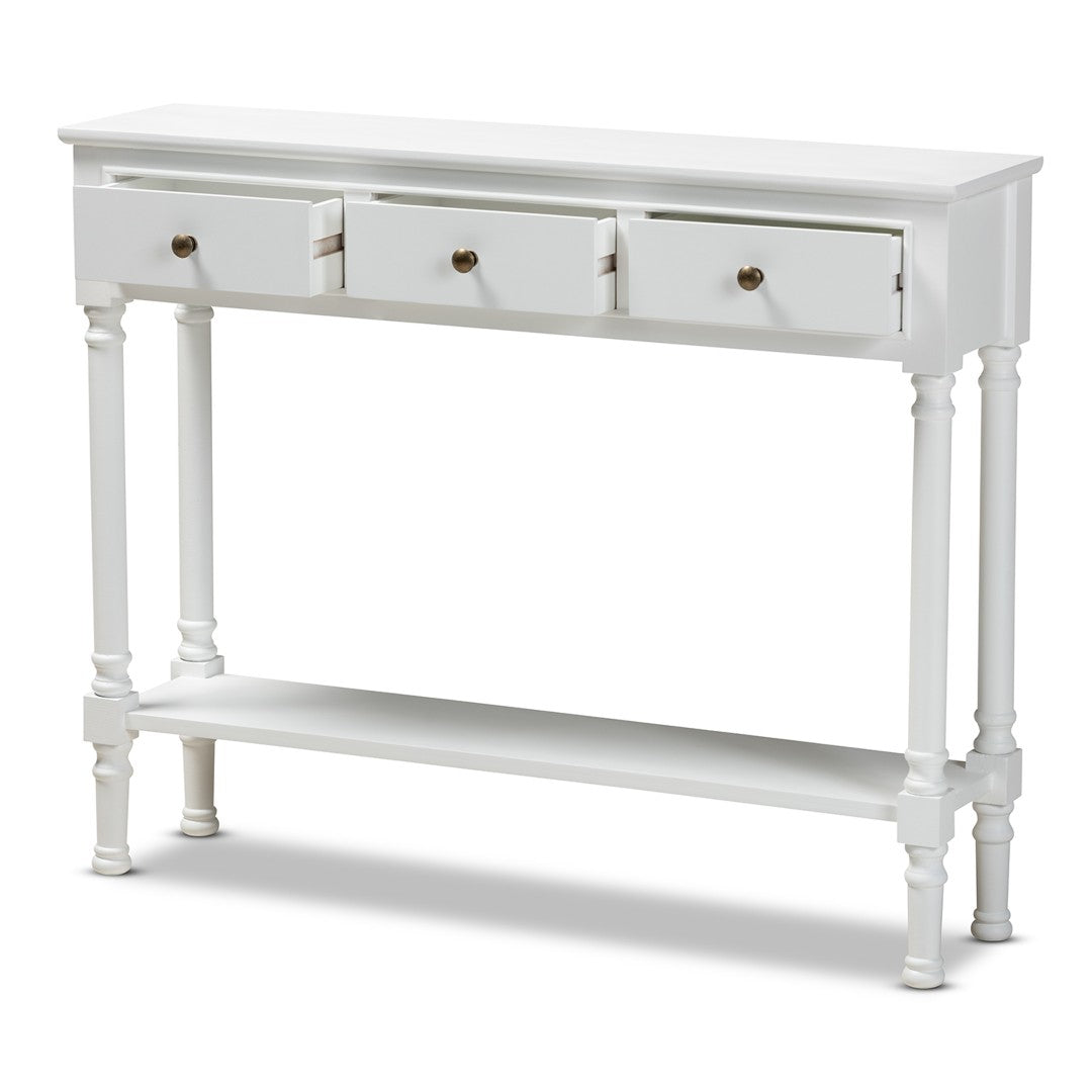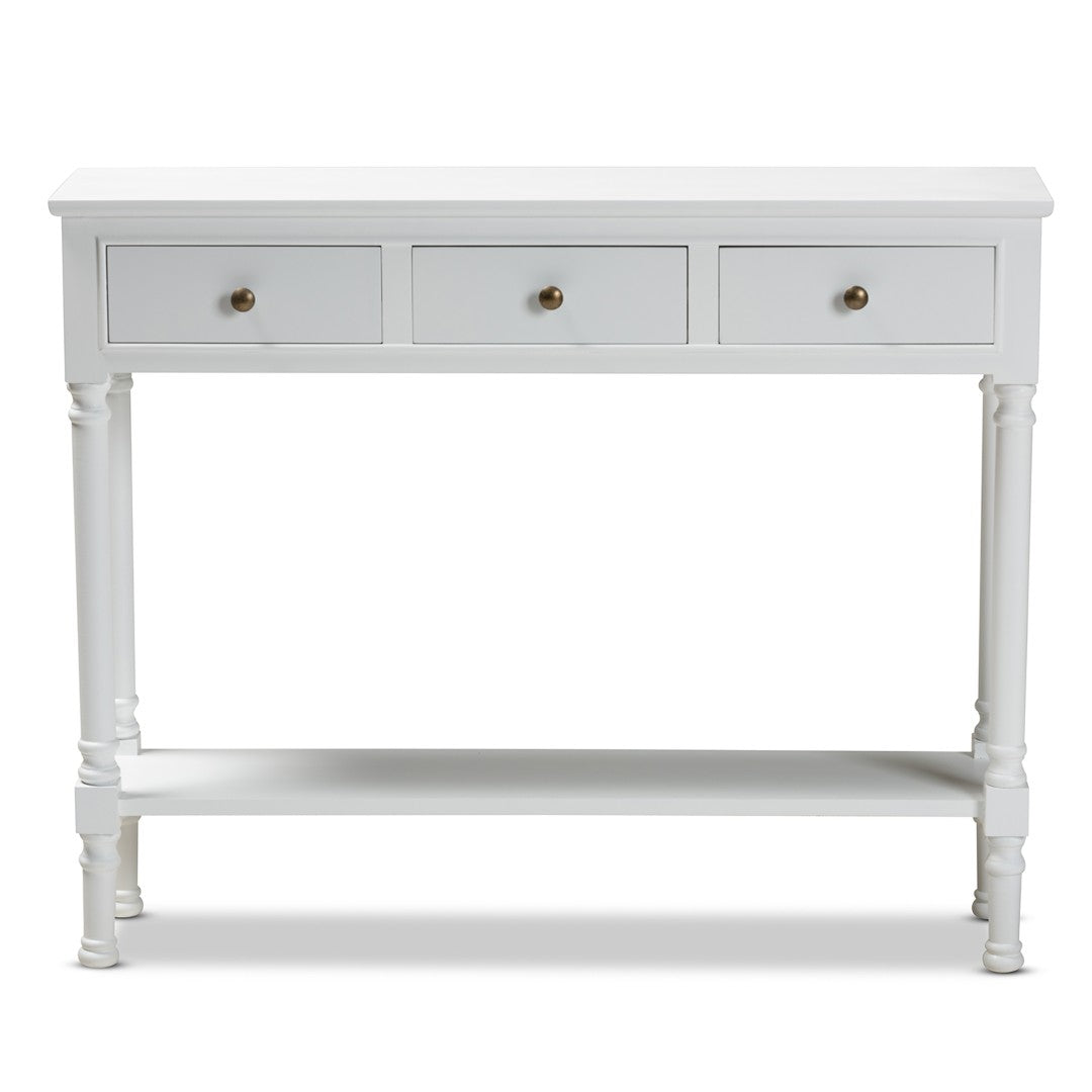 Give your entryway a bright, organized focal point with this Calvin console table — a balanced blend of classic farmhouse charm and modern clean lines. With practical storage, decorative shelving, and tasteful details like ring-turned legs and brass-tone knobs, it’s designed to keep essentials tidy while elevating your hallway, foyer, or living space.