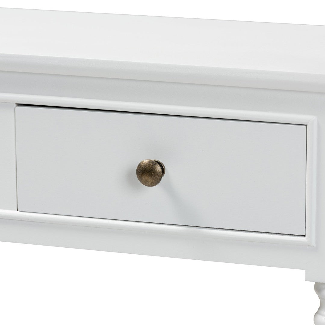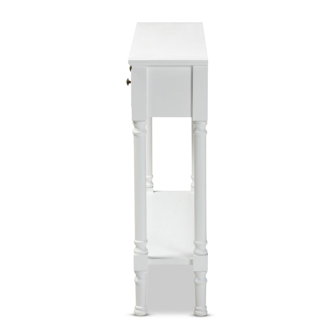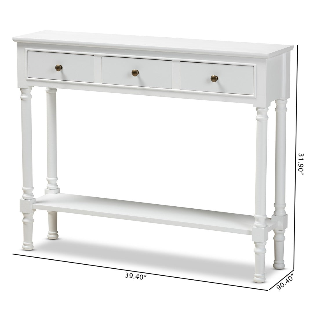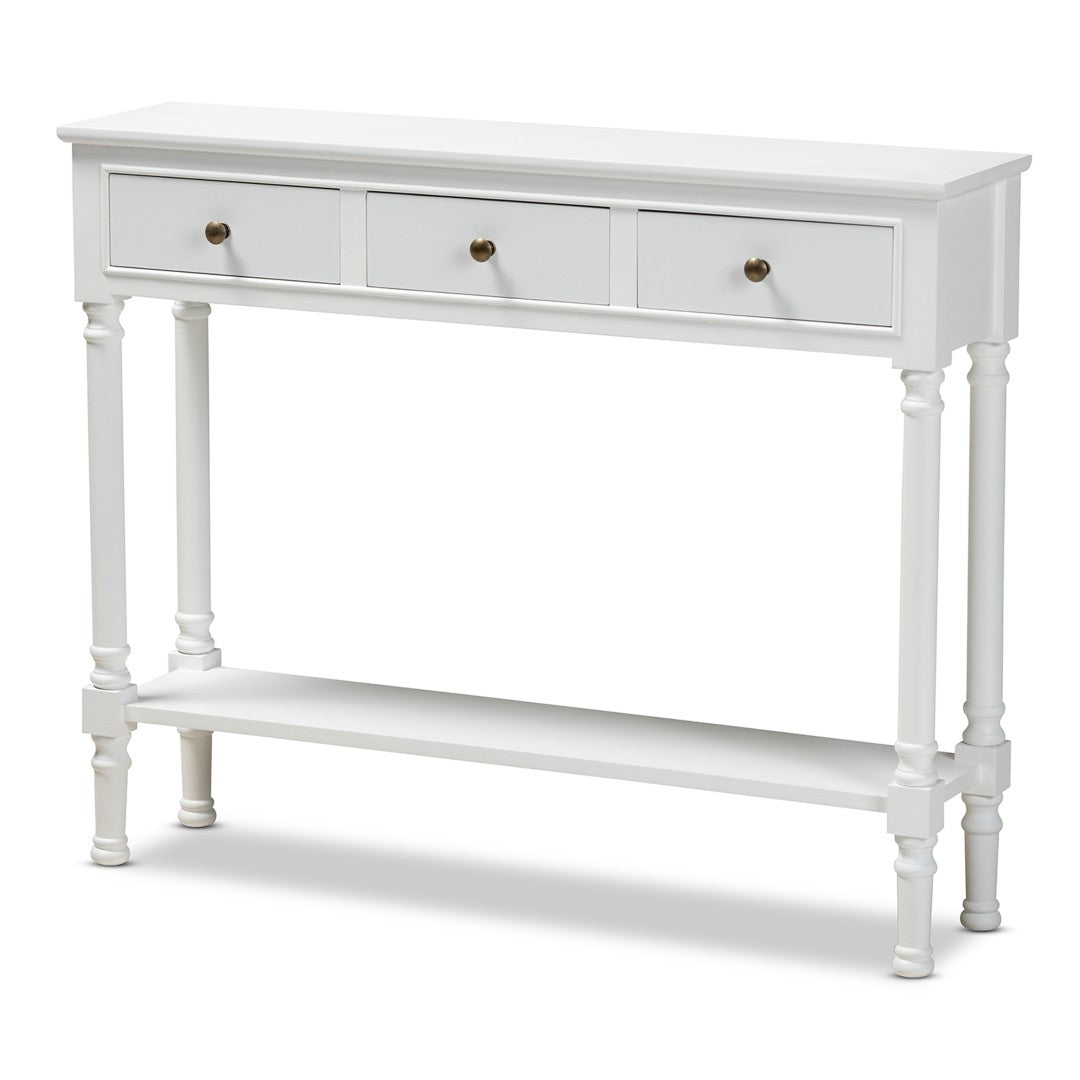 Give your entryway a bright, organized focal point with this Calvin console table — a balanced blend of classic farmhouse charm and modern clean lines. With practical storage, decorative shelving, and tasteful details like ring-turned legs and brass-tone knobs, it’s designed to keep essentials tidy while elevating your hallway, foyer, or living space.