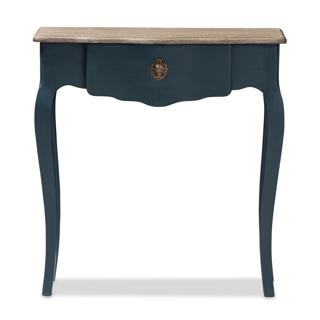 Bring classic provincial charm to your entryway, hallway, or living room with this elegant console table. Its graceful curves, blue-spruce finish, and scalloped drawer face deliver a refined farmhouse-French aesthetic while the greywashed top adds subtle contrast and texture. Well suited for a lamp, decorative accents, or everyday essentials, this piece combines decorative appeal with practical storage.