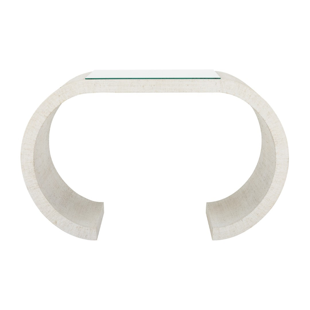 The Bridgers Console blends sculptural form with refined texture to make a memorable statement in compact spaces. Its rounded arched legs and grass-cloth wrapped body in a clean white finish provide both visual interest and a light, elegant presence—ideal for entryways, hallways, or behind sofas. Designed by Bill Cain, this console offers style without overwhelming a room.