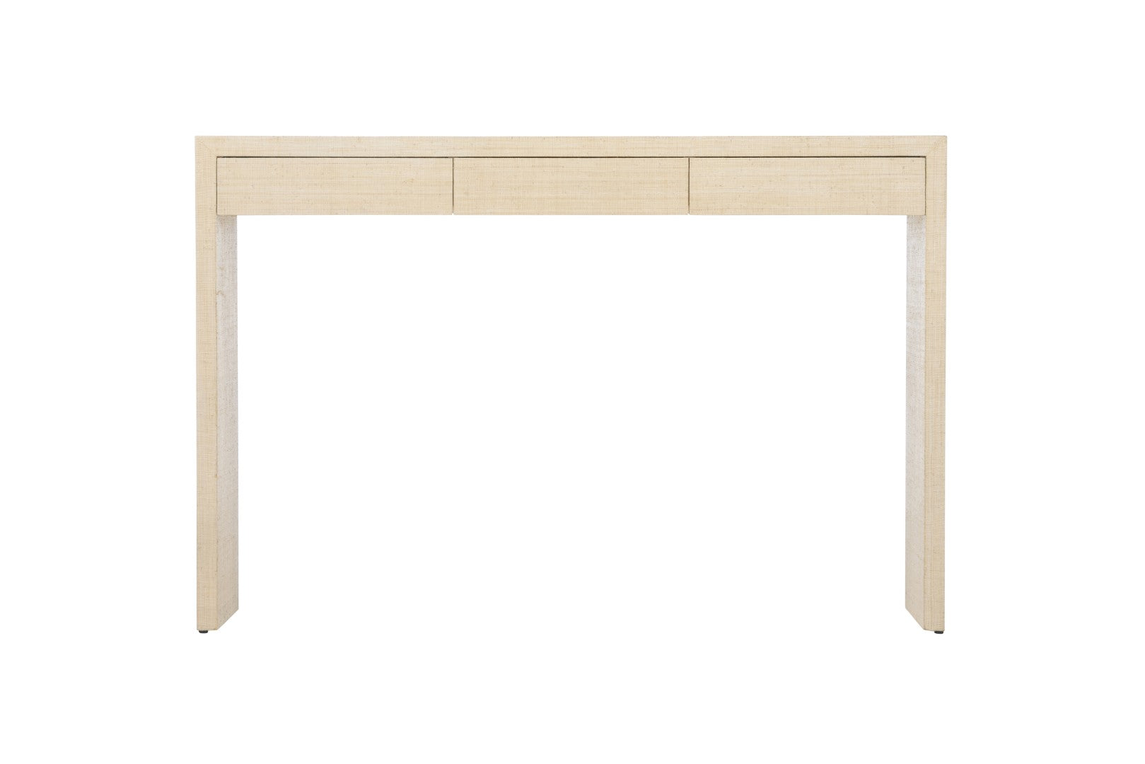 A refined statement piece that blends minimalist form with practical storage. This console’s cream raffia finish and clean lines bring organic texture and light to entryways, hallways, or living rooms, while its three subtle drawers keep everyday essentials neatly tucked away. Designed by Elizabeth Wicker, it offers style without sacrificing functionality.