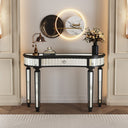 Elevate your entryway, bedroom, or dressing area with this elegant half-moon mirrored console that fuses glamorous styling with family-conscious details. The crescent silhouette and fluted glass panels amplify light and visual depth, while a crystal-knob drawer and solid hardwood construction deliver practical storage and lasting durability. Ideal as a vanity desk, foyer statement piece, or compact display surface, this table brings refined sparkle to small spaces without sacrificing safety or strength.