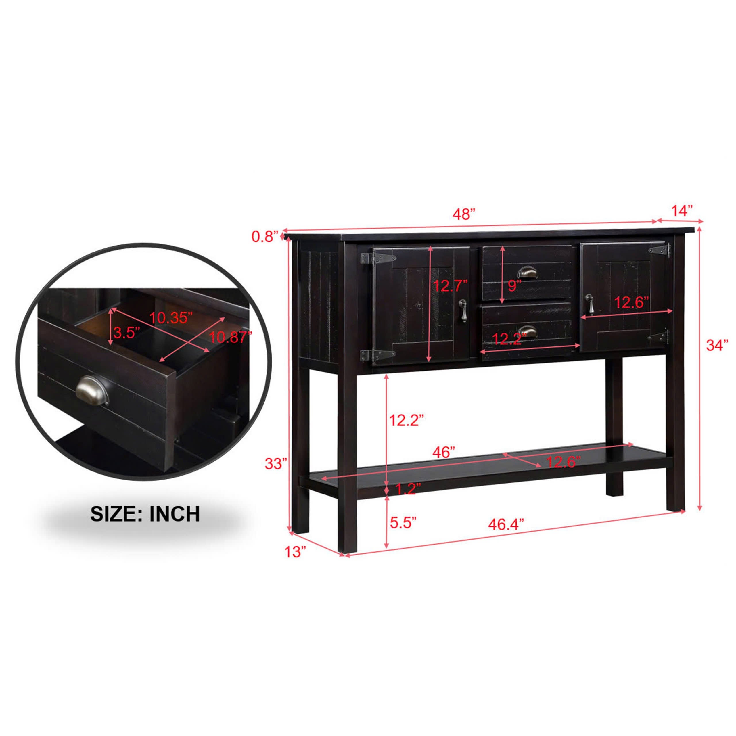 Bring timeless warmth and practical storage to your home with this 48" solid wood sideboard console table. Designed with a retro-inspired silhouette and a distressed espresso finish, it blends rustic charm with everyday functionality—perfect as a dining buffet, living room server, or entryway console. Solid wood construction on the tabletop, legs, and front frame ensures durability, while two drawers, dual cabinets and a spacious bottom shelf keep essentials organized and accessible.