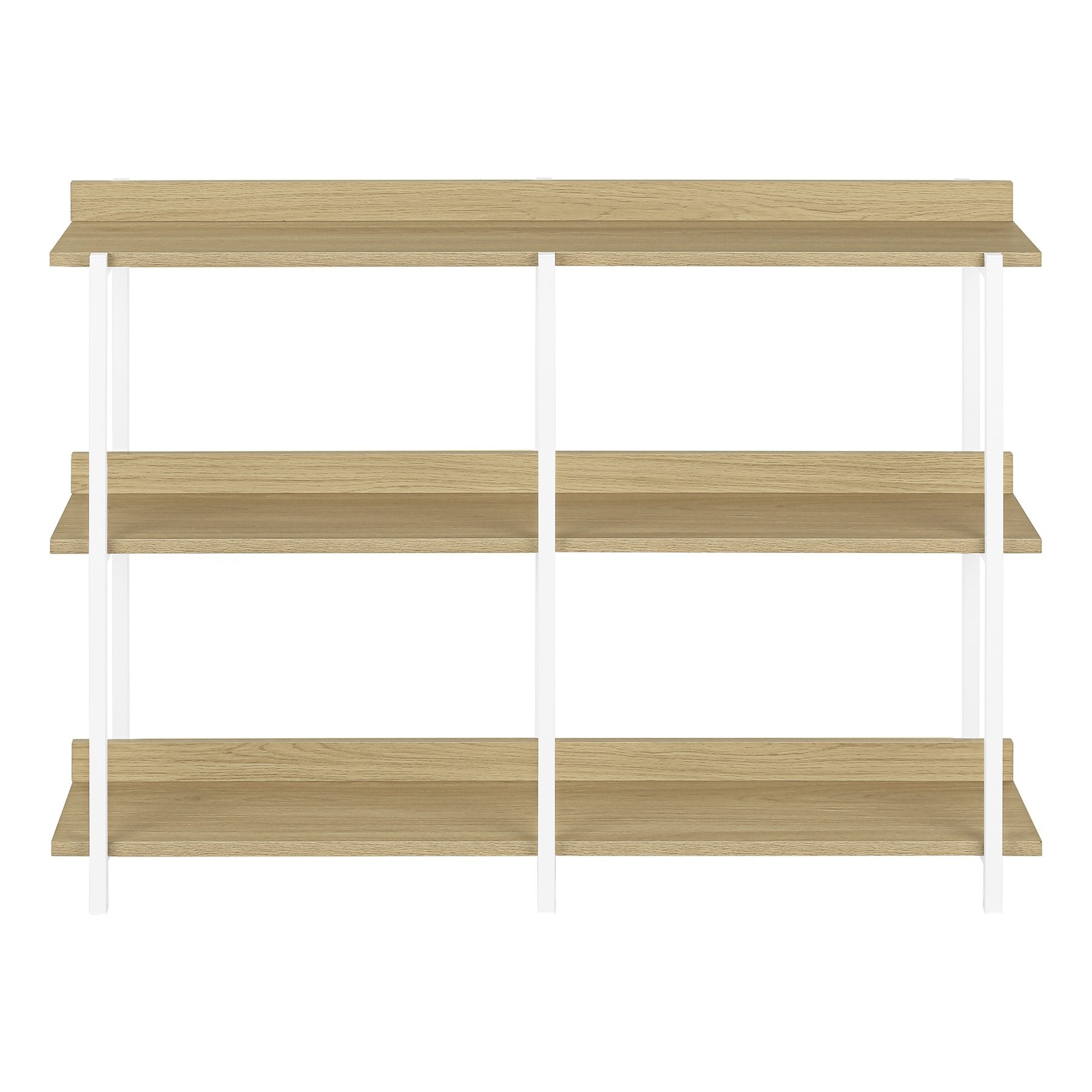- 3-tier console table featuring a long, rectangular tabletop and 2 storage shelves in a natural finish