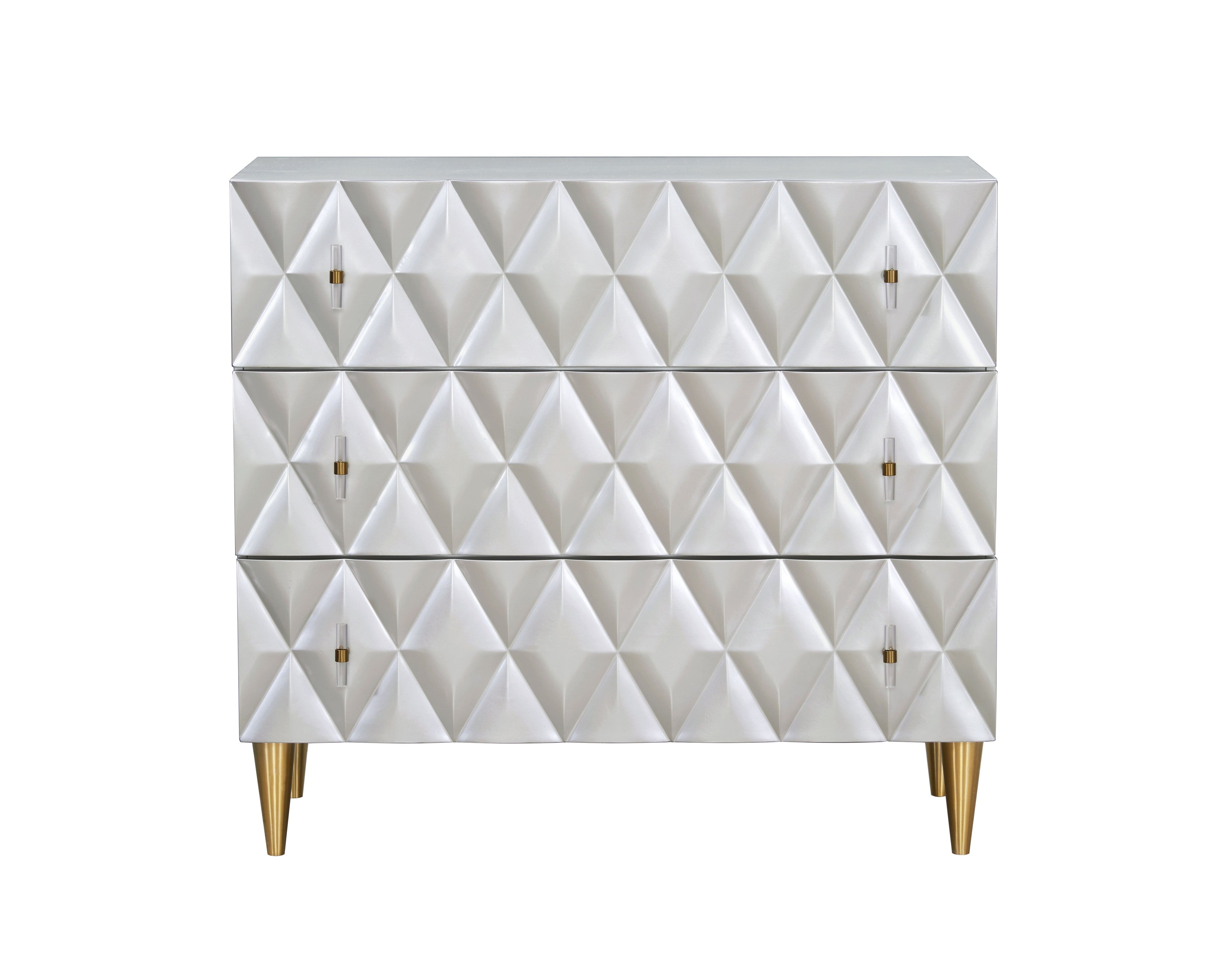 Elevate your entryway, living room, or bedroom with this chic console cabinet that blends contemporary glamour and practical storage. The Anson features a metallic silver and champagne finish, a sculptural 3D diamond-patterned drawer front, and gold-tone accents that create a refined focal point while offering smooth, organized storage for everyday essentials.