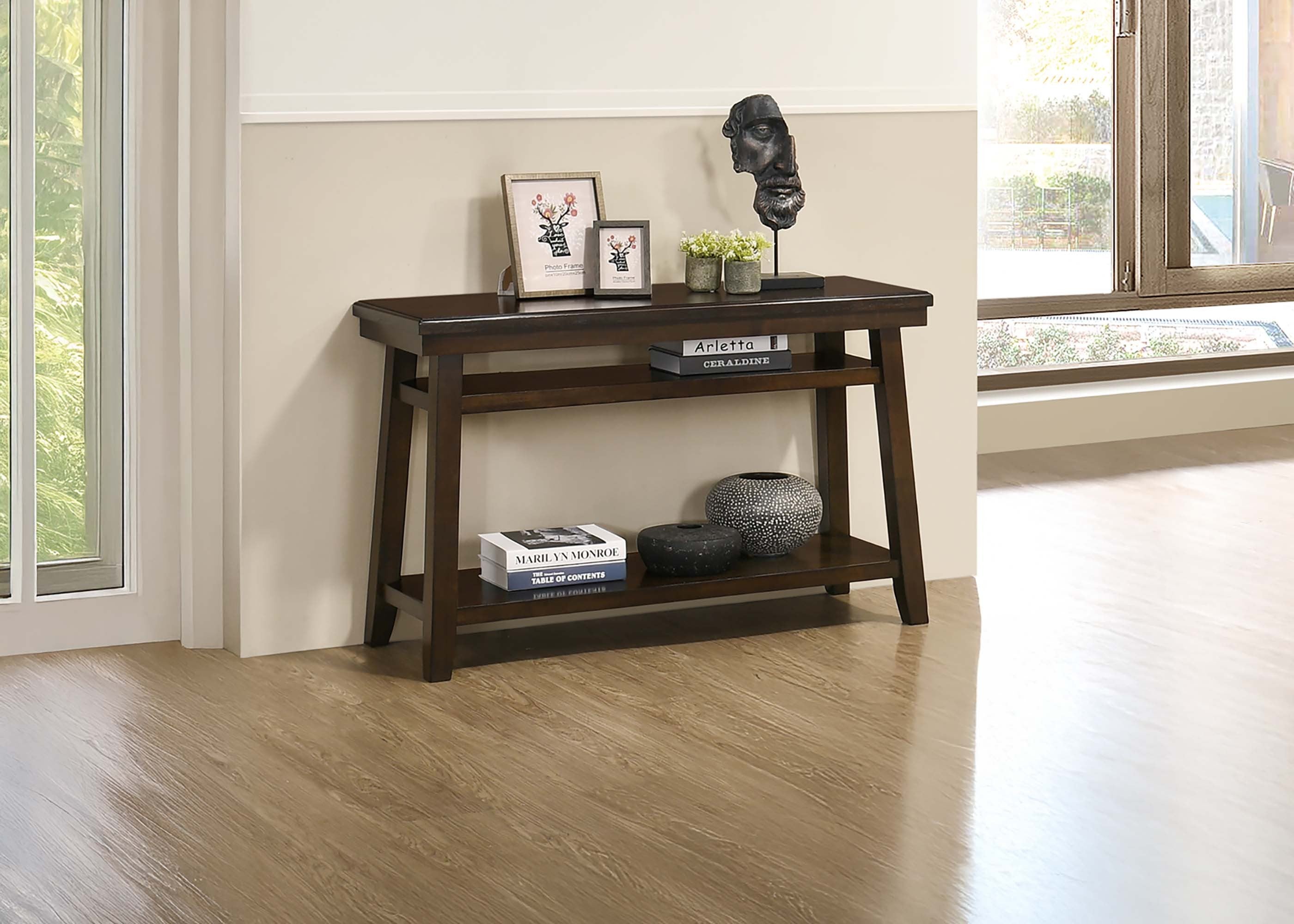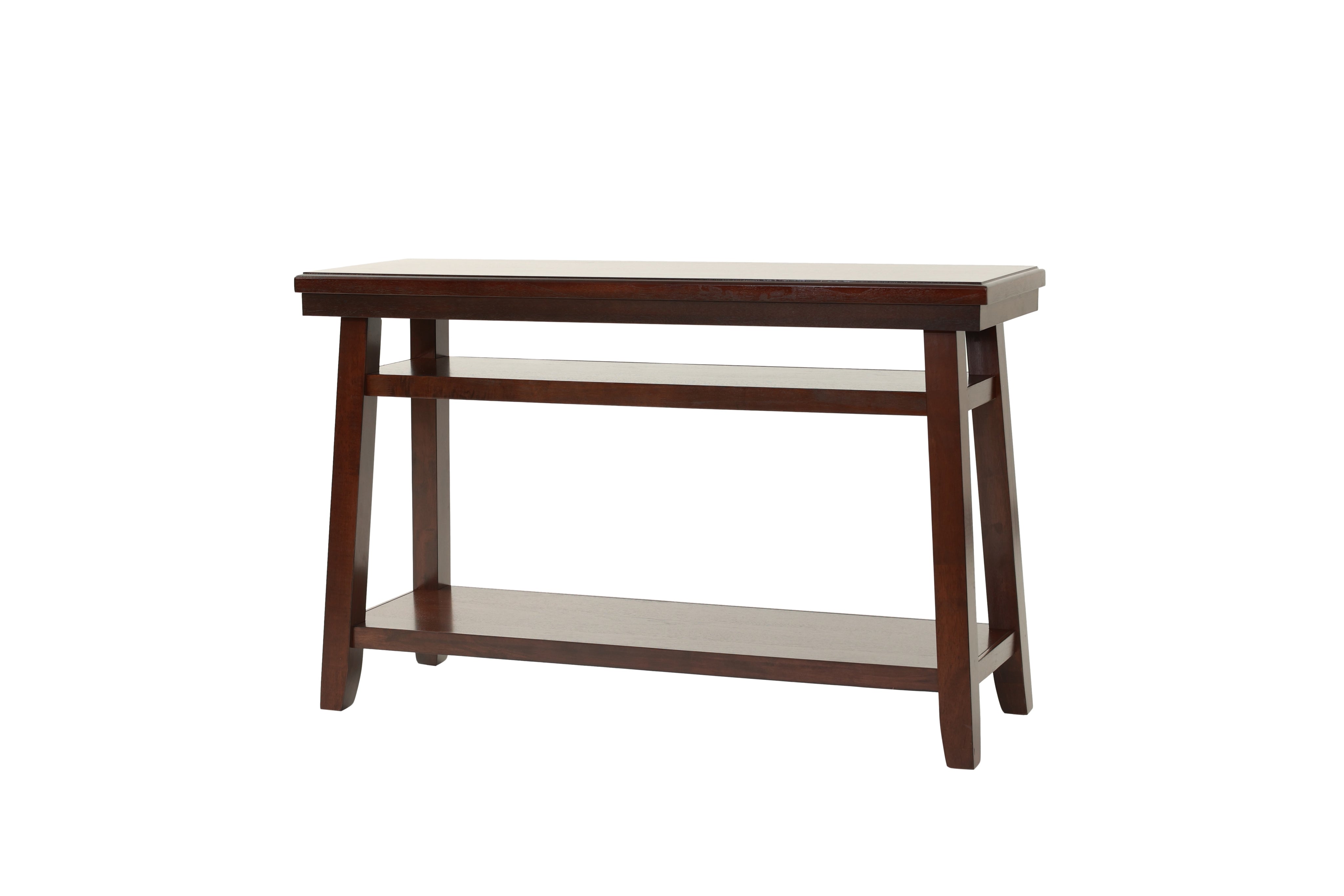 Give your living room a clean, modern upgrade with this elegant walnut-finish console table. Designed for both style and function, it features a warm walnut veneer top, solid rubberwood legs, and a convenient open shelf for storage or display. Its streamlined silhouette fits behind a sofa or along a hallway, making it a versatile addition to contemporary and transitional interiors.