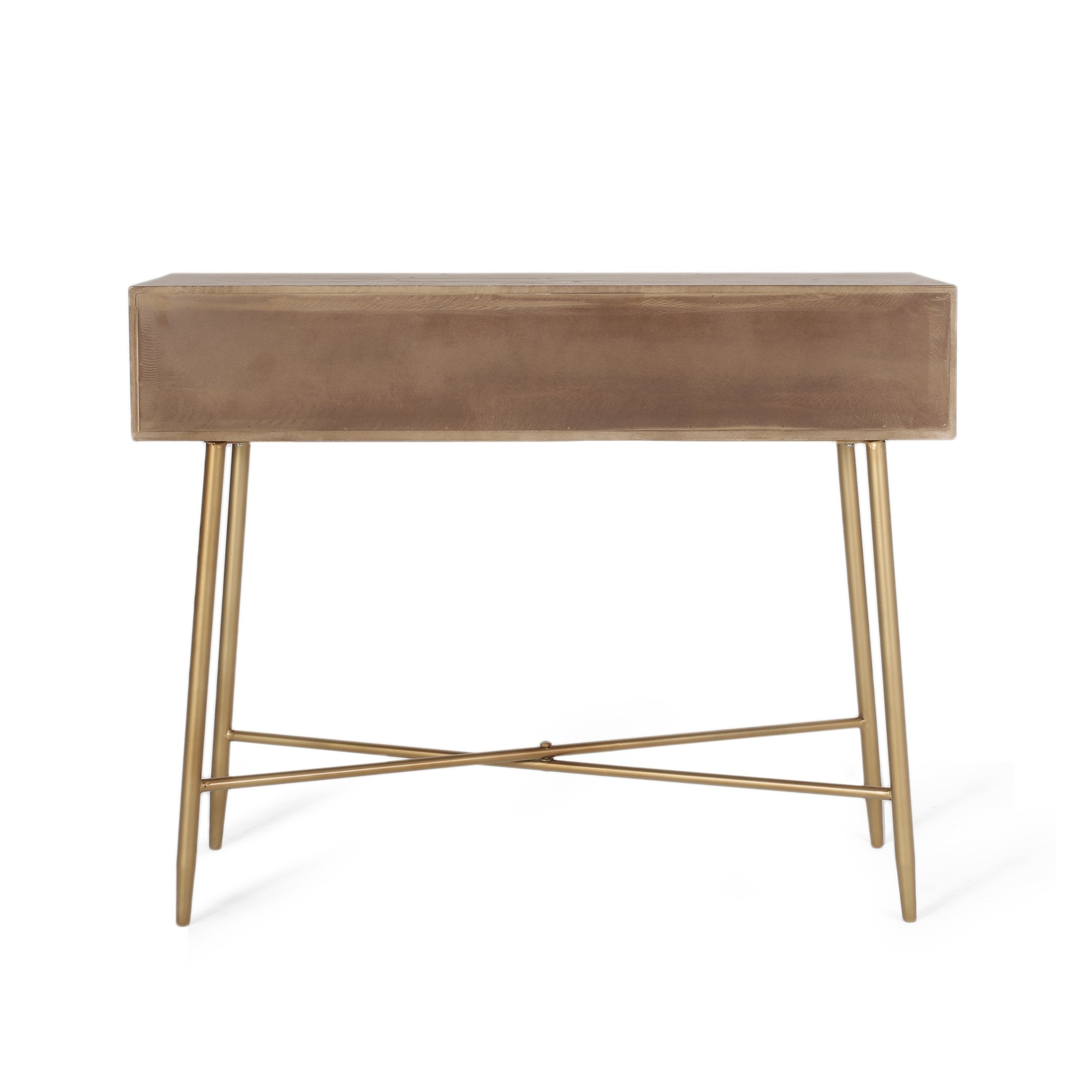 - Strike a bold statement for your home right as you walk in through your front door. Our outstanding console table brings a perfect amount of rustic charm and stunning glam style to your home. Featuring a rich wood-like structure supported by an antique gold toothpick frame, our accessory is an excellent accent piece for any living room or hallway. This is finished with two sliding doors for storing and organizing small items, giving every interior space a practical and refreshing touch.