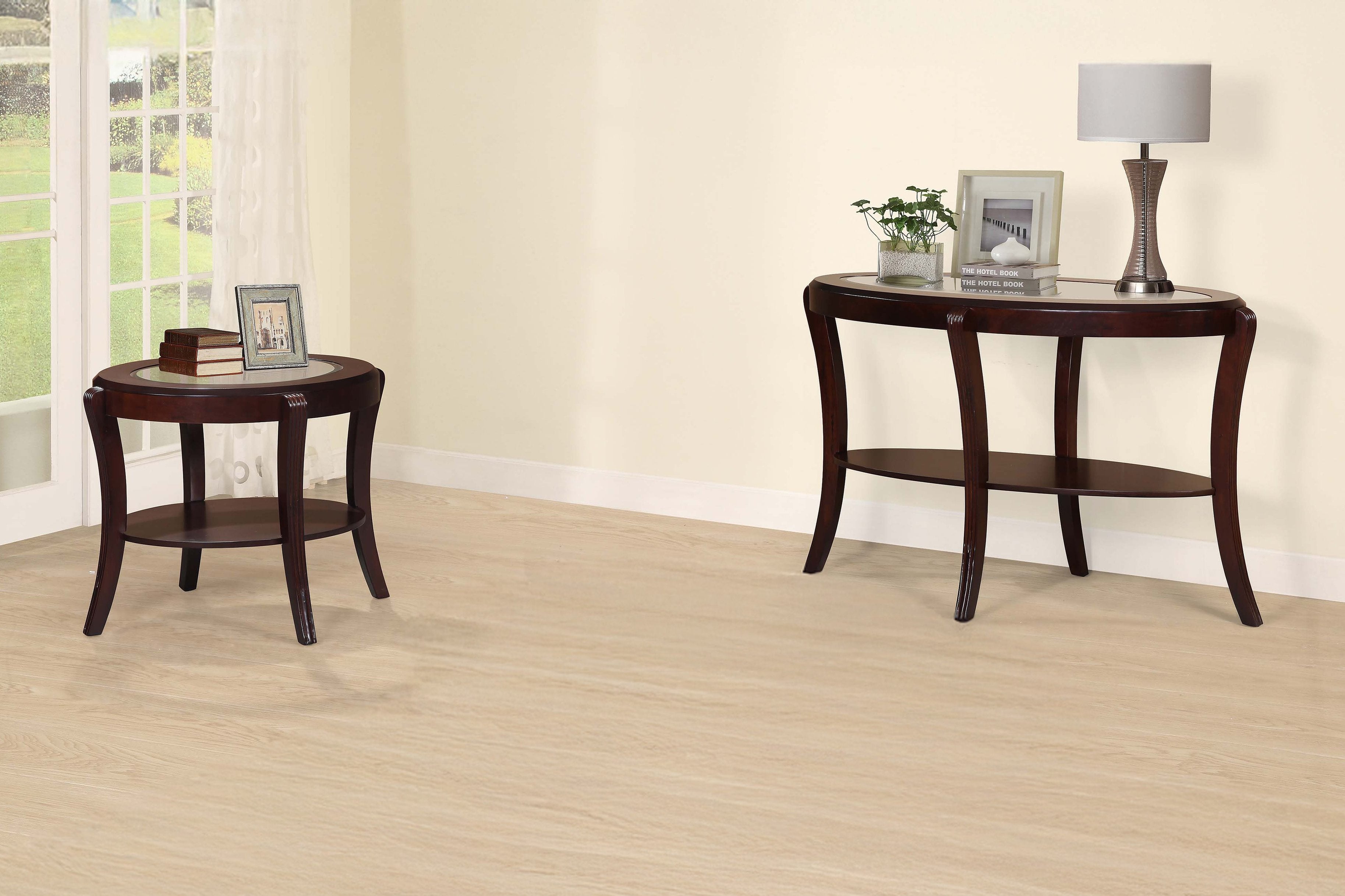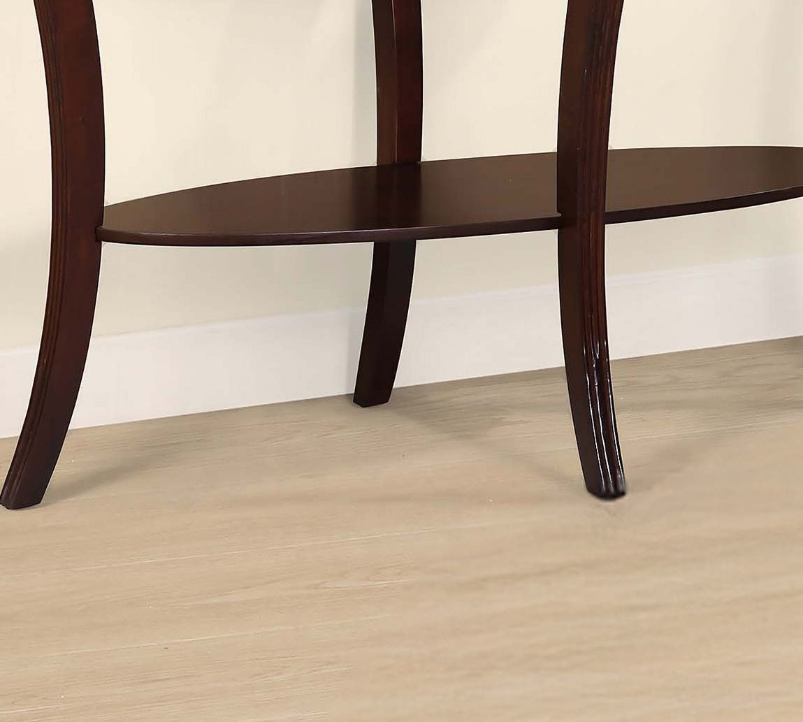Elevate your living room with this timeless transitional console table, blending classic design with practical functionality. Finished in a rich dark cherry/espresso tone and topped with a clear 5mm tempered glass insert, it provides an elegant surface for display while offering open storage for books, décor, and everyday essentials.