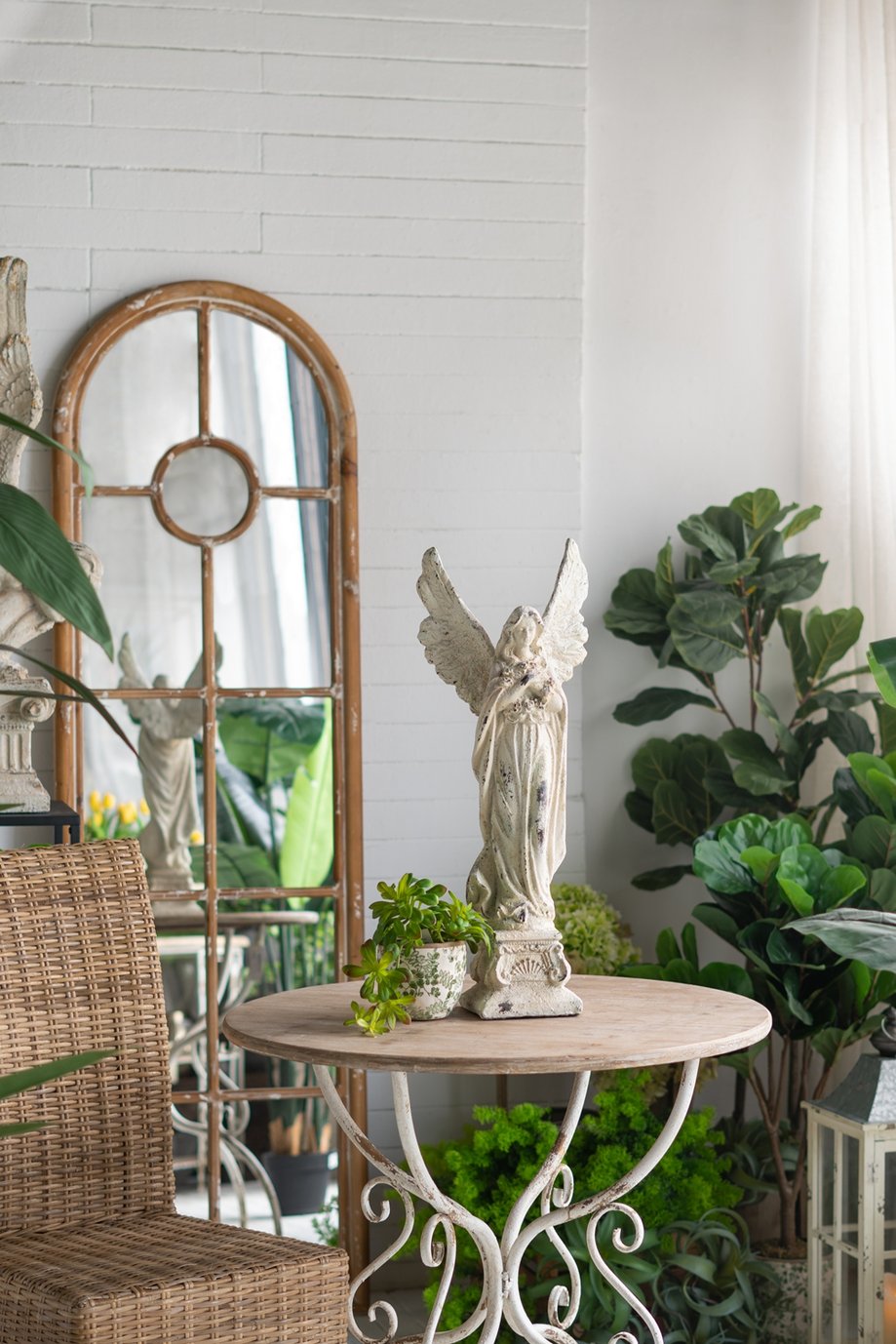 Bring timeless farmhouse charm to any room with this elegant round wooden table. Its distressed white finish and ornate metal scrollwork legs combine rustic warmth with refined detail, making it equally suited for casual dining, a cozy breakfast nook, or as an eye-catching accent in an entryway, living room, or office. Durable construction and thoughtful proportions ensure both style and everyday functionality.