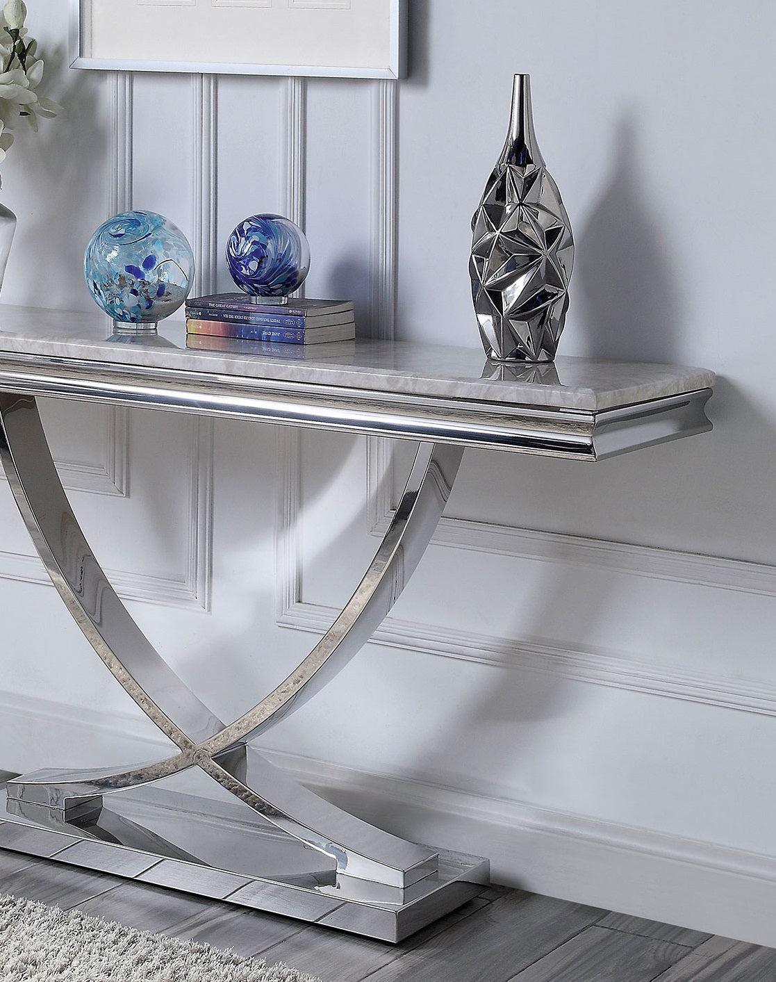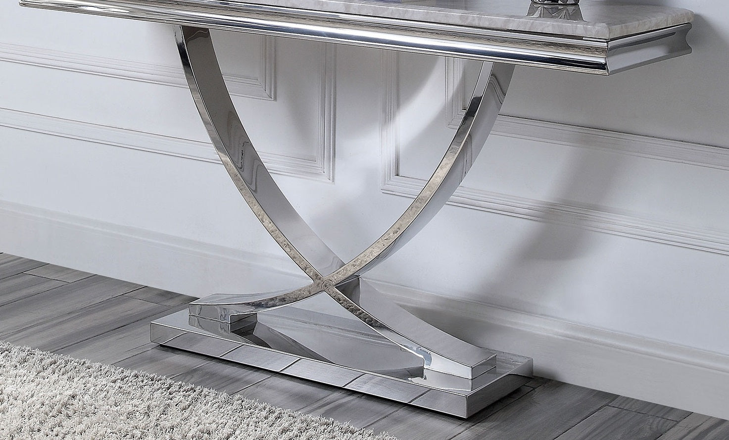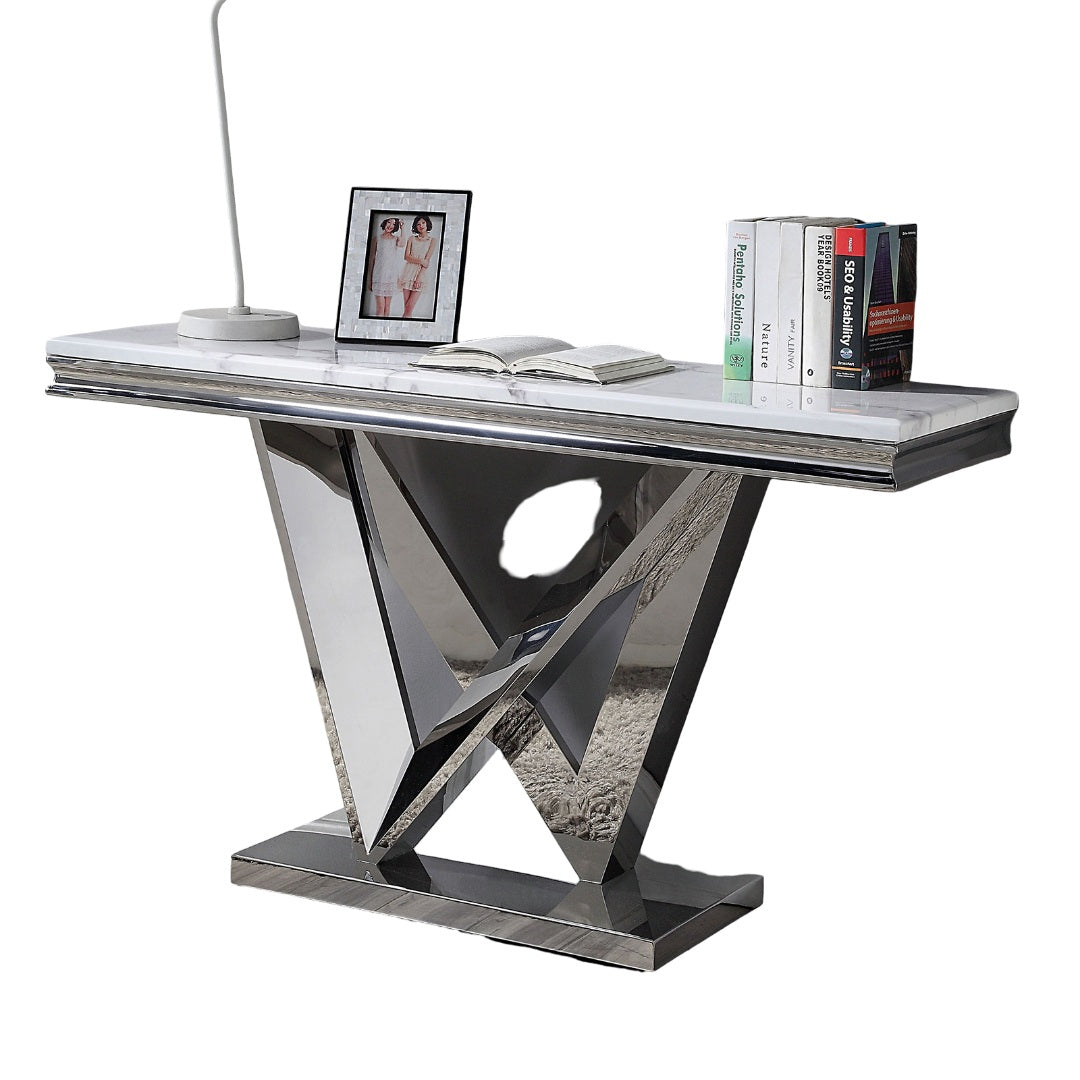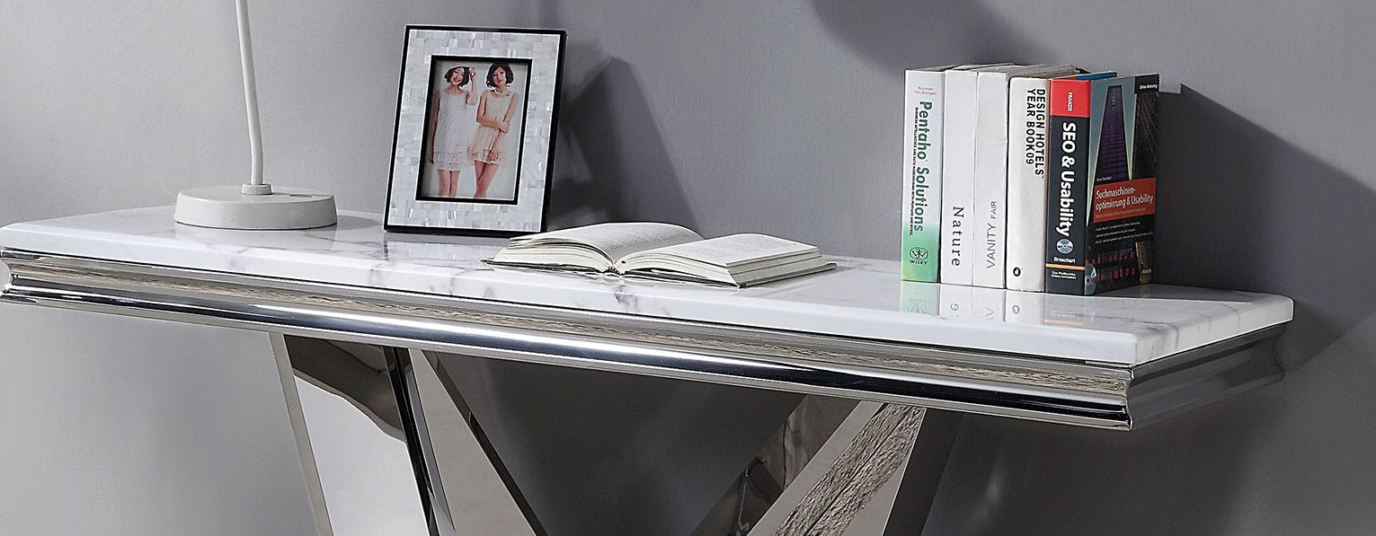 Elevate your living space with a striking blend of modern glamour and sturdy design. This sofa table pairs a luxurious faux marble top with polished chrome pedestals for a refined focal point that complements contemporary and transitional interiors. Thoughtfully proportioned for behind a sofa or against a wall, it adds surface area for lamps, decor, and everyday essentials while making a bold style statement.