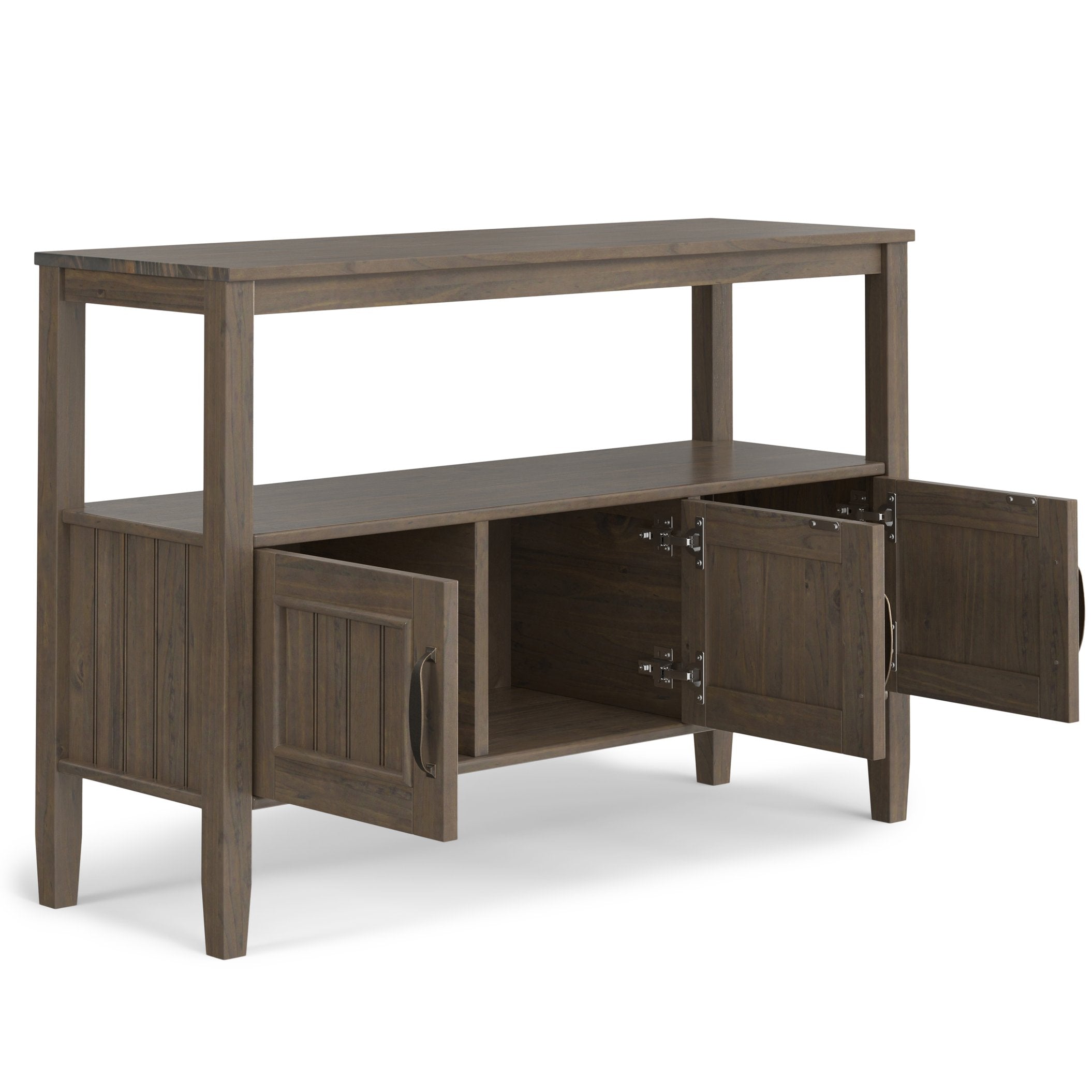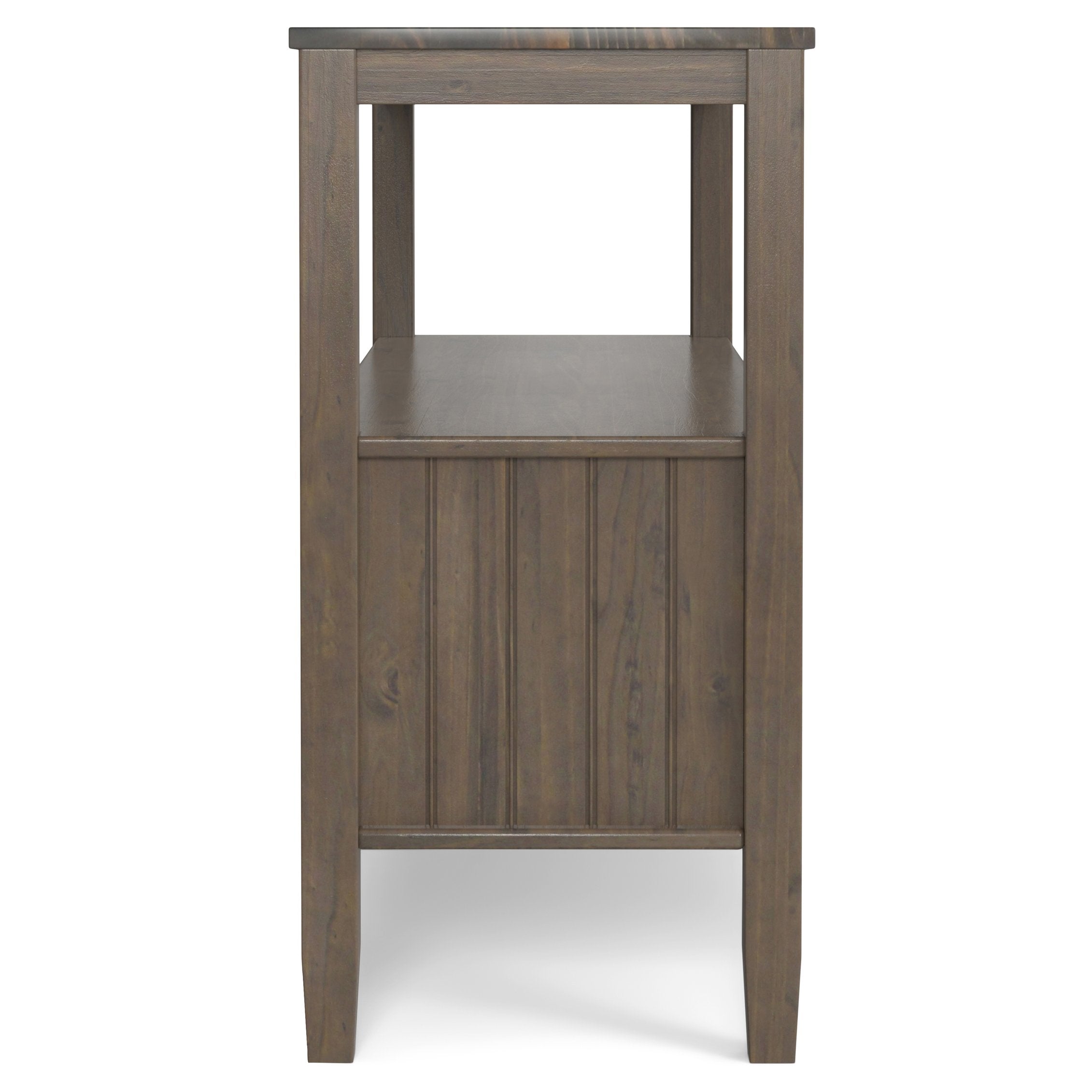 Elevate your entryway or living space with the Lev console table in Smoky Brown — a handcrafted, transitional piece that blends functional storage with refined, rustic character. Finished in a smoky brown stain and sealed with a protective NC lacquer, this console showcases solid wood grain and thoughtful details like grooved panels and brushed bronze hardware to suit a range of interiors from modern to traditional.
