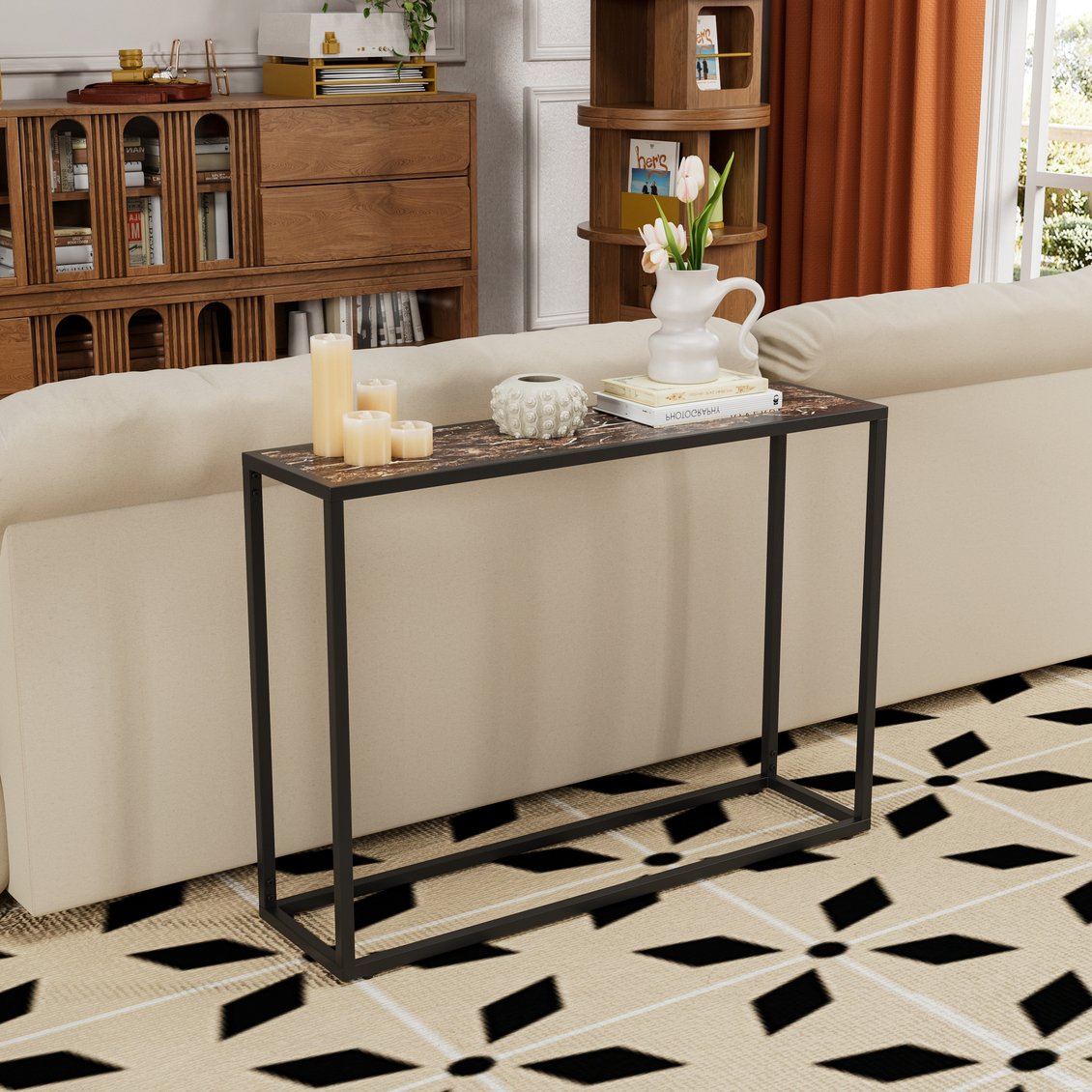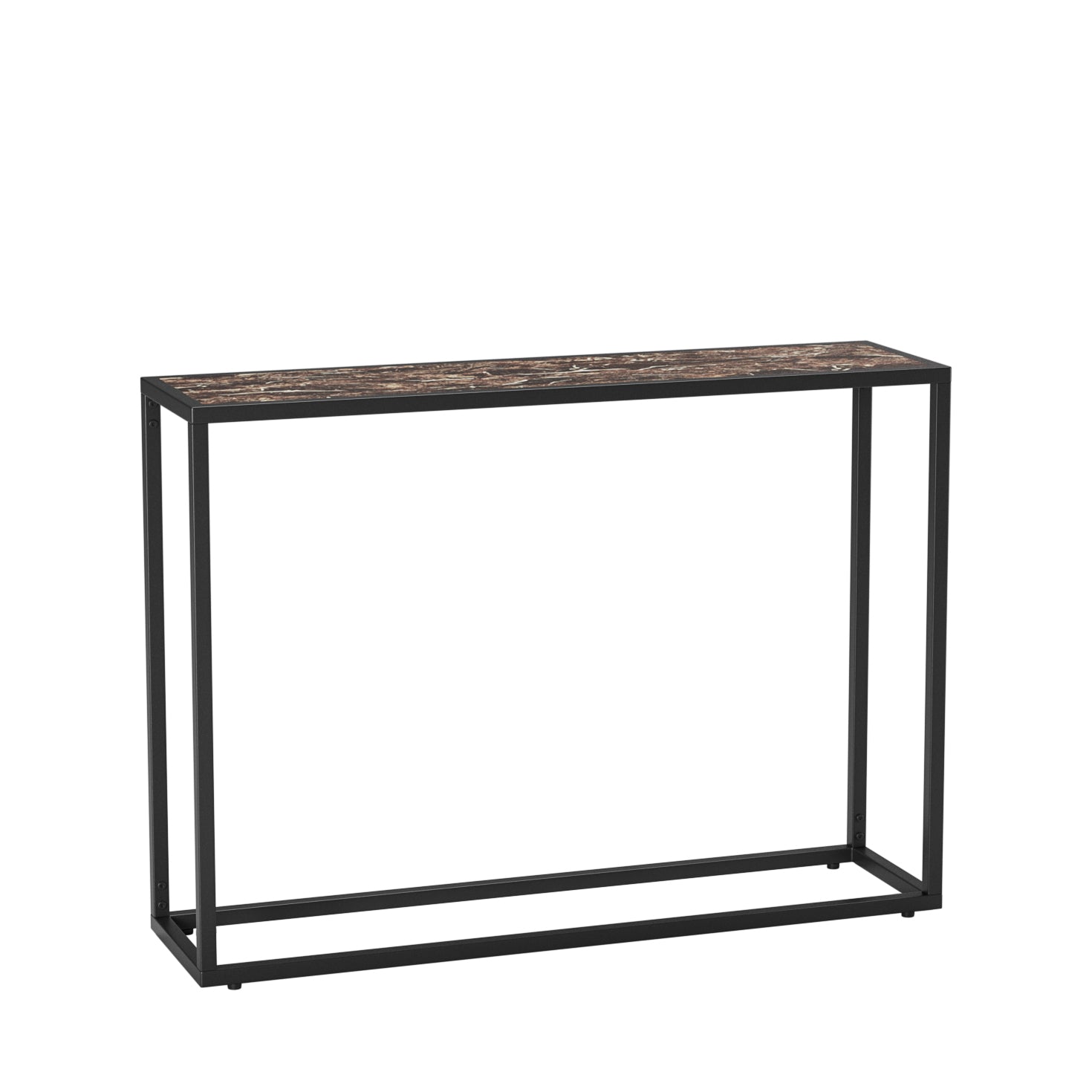 Elevate tight entryways and narrow living spaces with this sophisticated, space-saving console table. Its industrial-rural design pairs a warm brown, marble-like top with a matte black metal frame for a refined yet rugged look. Built for stability and everyday use, this slim-profile table provides a stylish surface for decor, keys, plants, or mail while fitting comfortably behind sofas or along corridors.