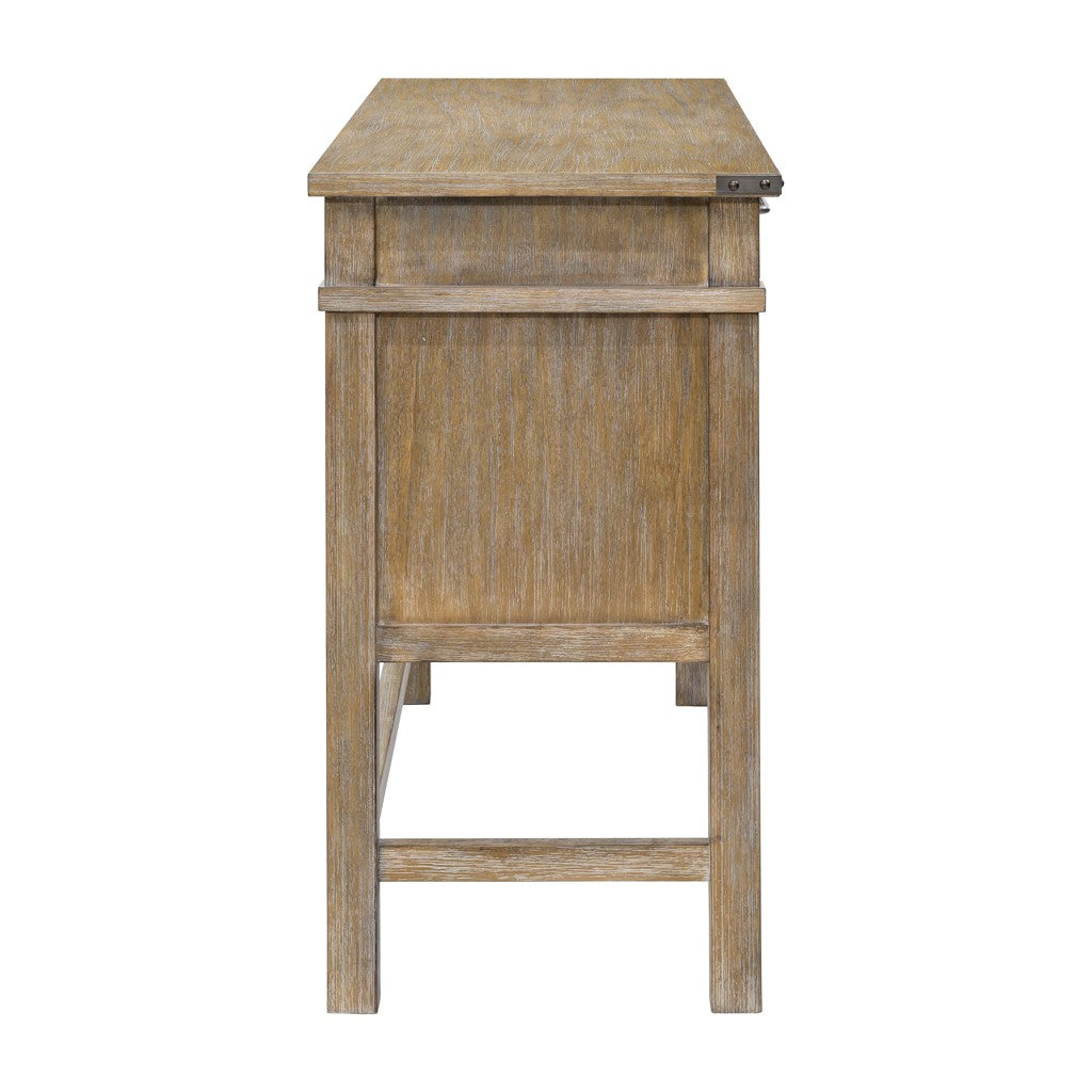 - Materials & Finish: MDF top with solid wood base and wood veneer panels; reclaimed natural finish on top and base