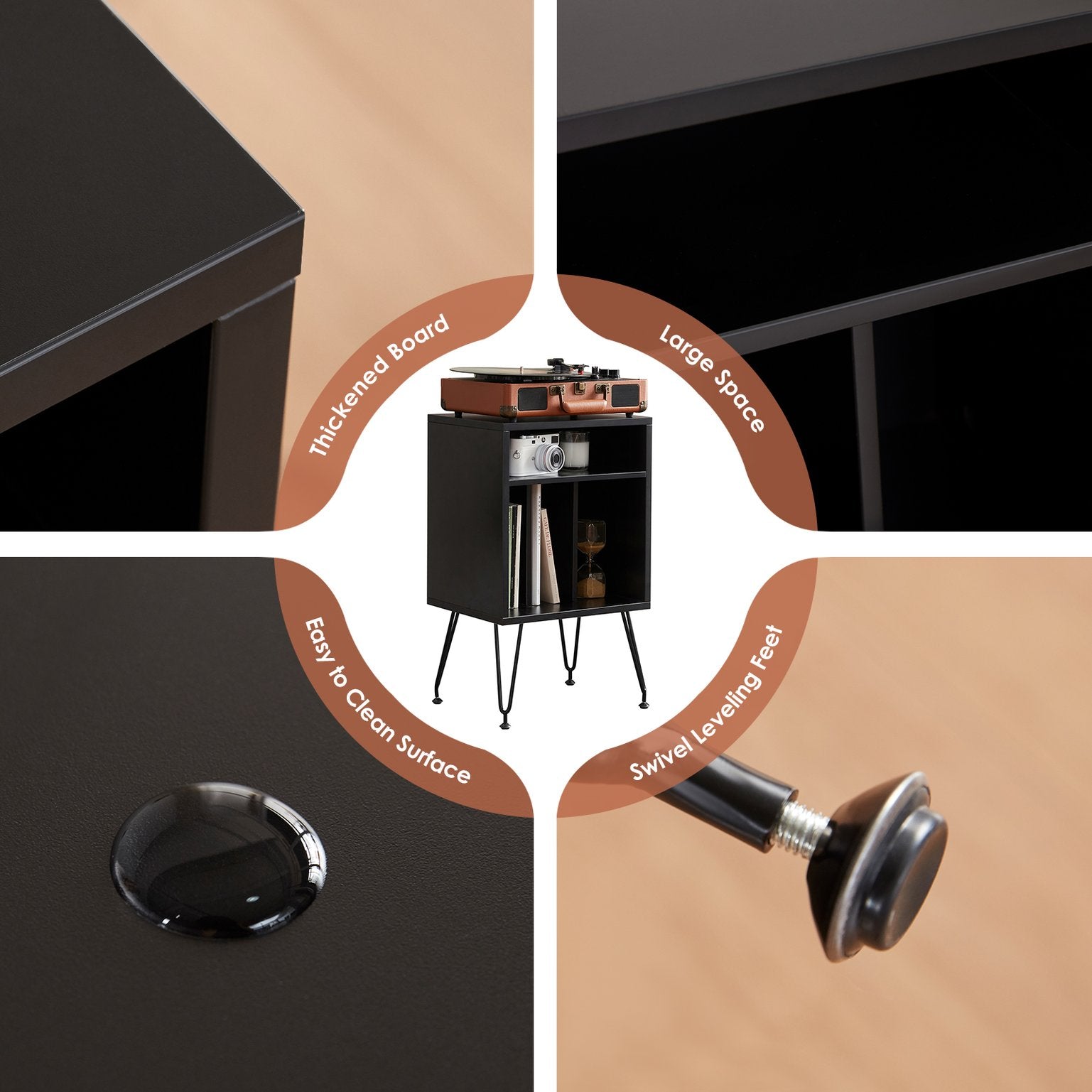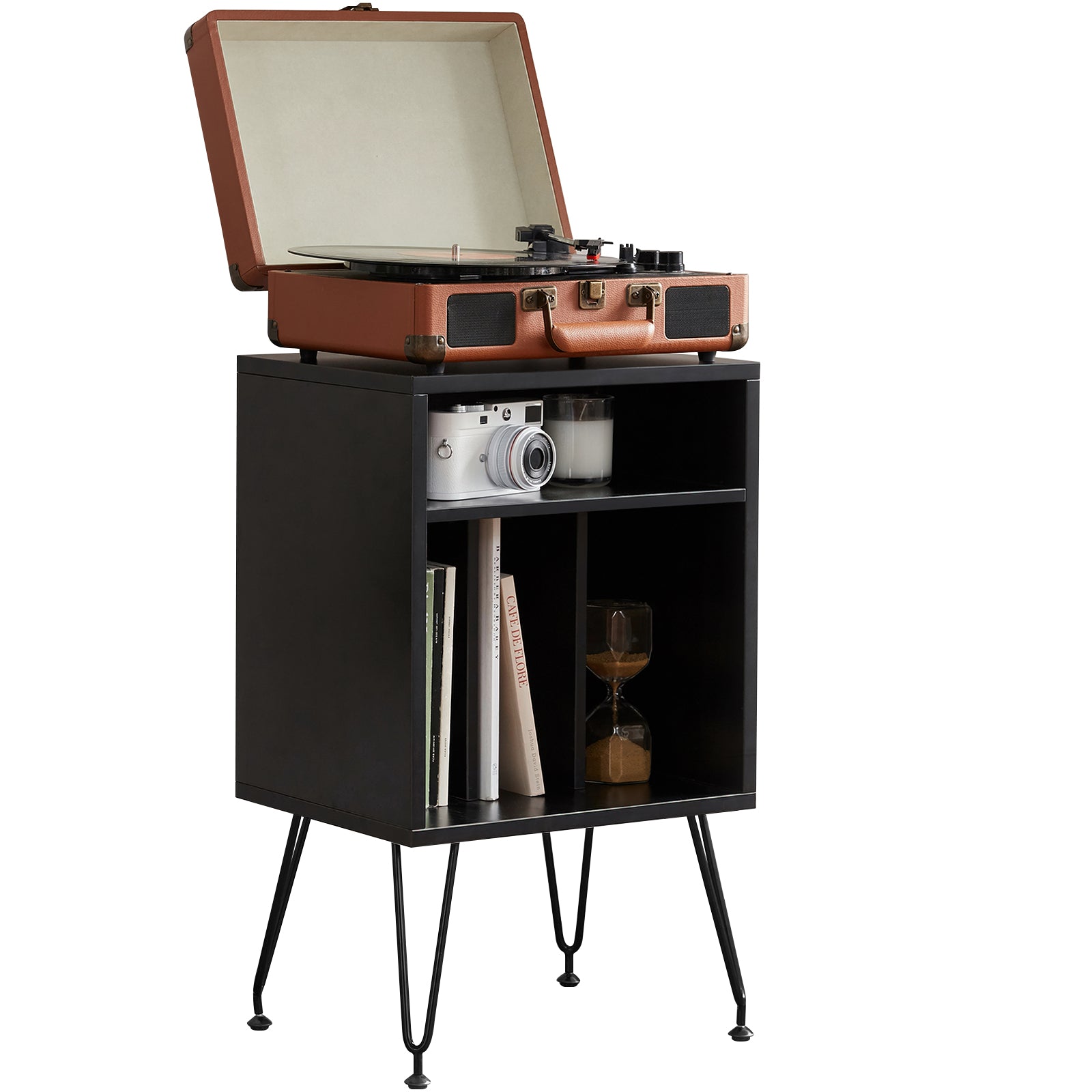 Keep your turntable and vinyl collection stylishly organized with this compact, modern record player stand. Built from durable engineered wood with sleek black finish and adjustable metal legs, it offers a dedicated surface for your record player plus concealed storage and smart details that make setup and placement simple. Ideal for living rooms, dens, or any listening nook where space and aesthetics matter.